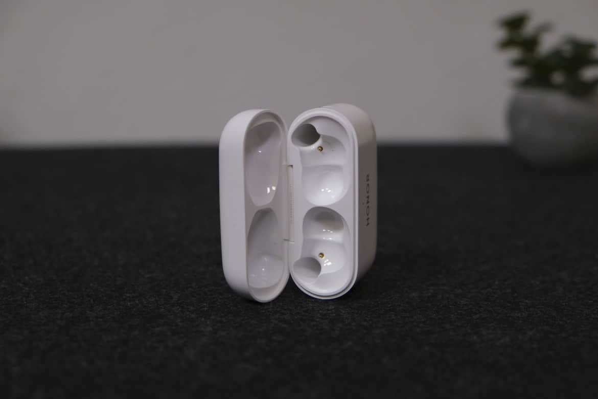 Auch das kompakte Ladecase mit Abmessungen von 46 x 61 x 25 mm ist eher schlicht gehalten. Über dem Honor-Schriftzug an der Front befindet sich eine LED-Anzeige, die über den Akkustand informiert. An der Unterseite ist der USB-C-Eingang zum Aufladen des Akkus platziert. Auf der rechten Seite finden wir einen kleinen Button, mit dem das Pairing via Bluetooth angestoßen wird.