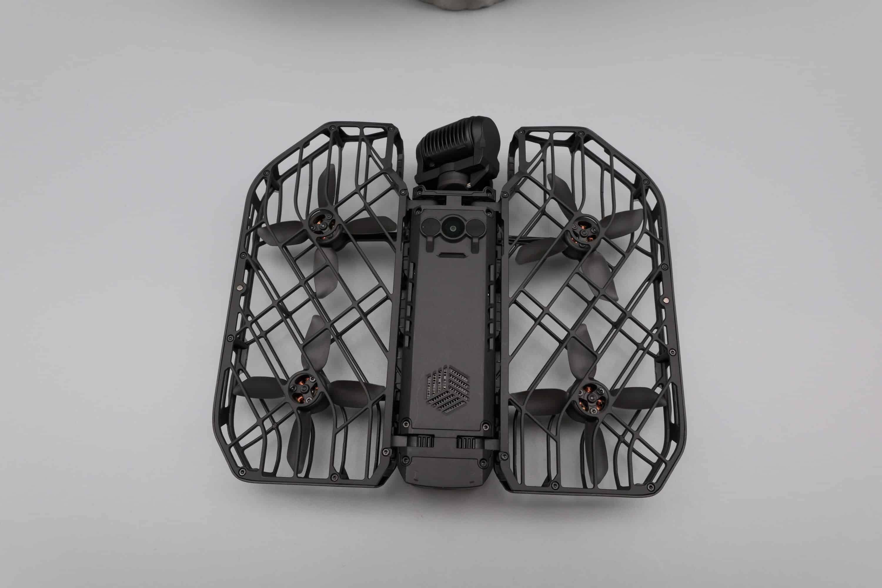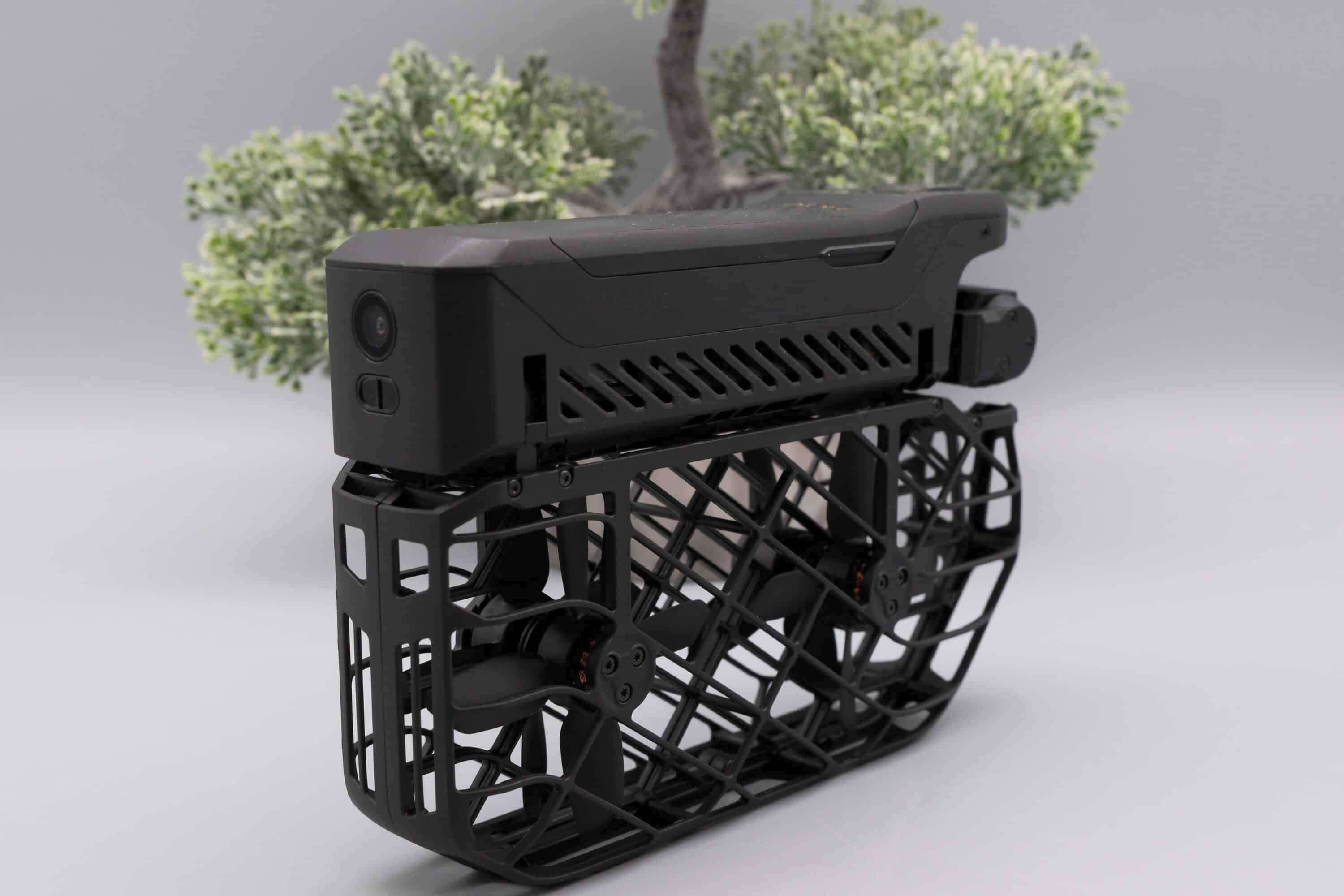Optisch erinnert das neue Modell stark an die X1. Die Rotoren sind von einem robusten Kunststoff-Käfig umgeben, der diese nicht nur schützt, sondern auch einen Start aus der Hand erlaubt. Dabei sind beide Käfige werksseitig nach unten geklappt, womit die in der Drohnenklasse C0 beheimatete HOVERAir X1 PROMAX besonders kompakt transportiert werden kann.