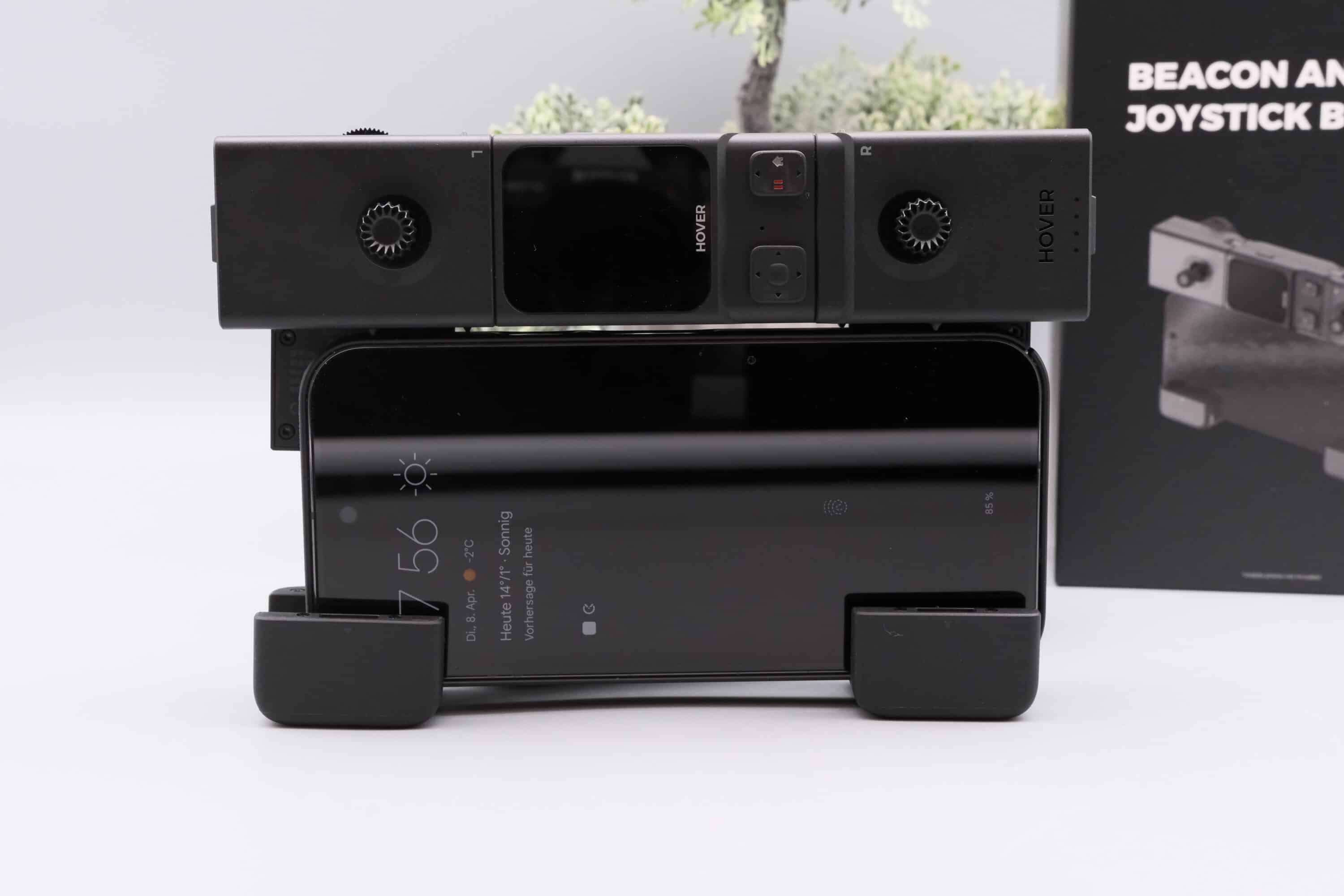 Die dritte Option ist die Verwendung des Beacon mit beiden Griffen, also links und rechts. Hier könnt ihr diese dann nach unten klappen und euer Smartphone in die so entstehende Halterung einsetzen, um die HOVERAir X1 PROMAX mithilfe zweier Joysticks zu steuern. Im Lieferumfang befinden sich zwei verschiedene Arten an Joystick, die einfach in die dafür vorgesehenen Öffnungen eingesetzt werden.