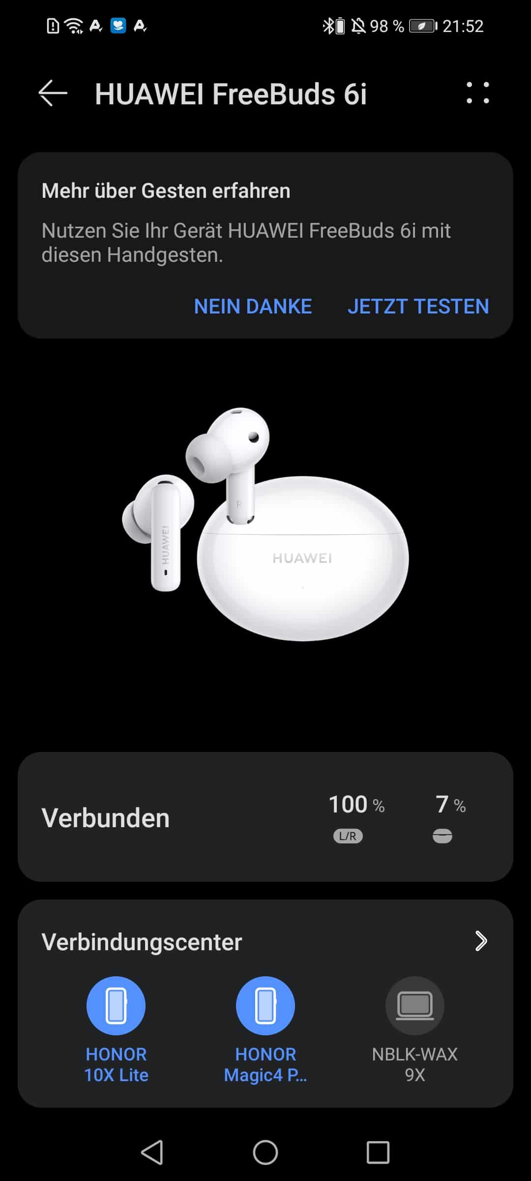 Was mir persönlich sehr gut gefällt ist, dass die FreeBuds mit mehreren Endgeräten gleichzeitig gekoppelt werden können. Ideal wenn ich zum Beispiel im Homeoffice die Huawei FreeBuds 6i für den Videocall am Arbeits-PC und im Anschluss für die aktive Pause über mein Smartphone benutzen kann.