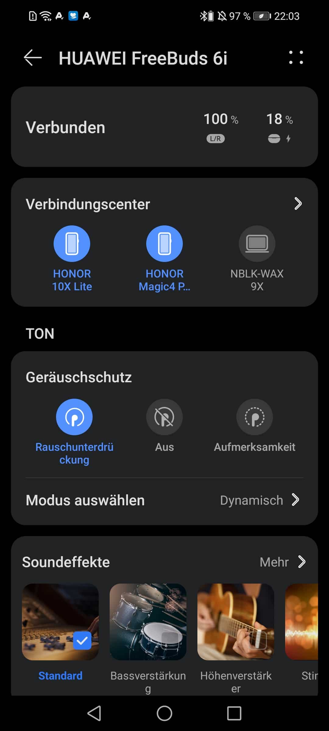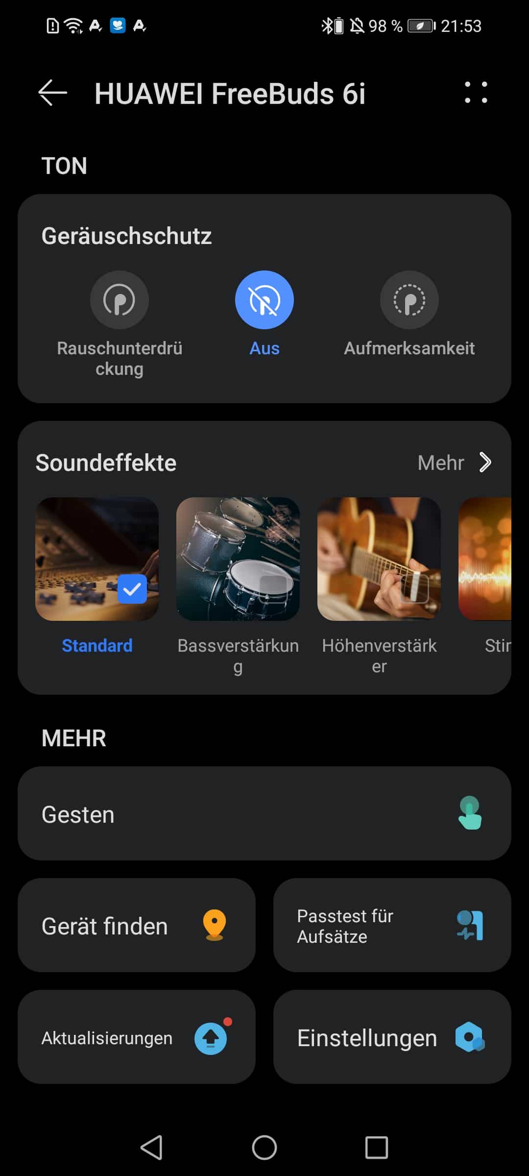 Wie bereits erwähnt kann das Klangbild der Huawei FreeBuds 6i über die AI Life App angepasst werden. Neben den vorgefertigten Klangbildern des Herstellers, können weitere individuelle Abstimmungen programmiert und gespeichert werden. Das finde ich sehr Nutzerfreundlich und ermöglicht mir, die FreeBuds auf meine Musik und mein Hörbereich abzustimmen.
