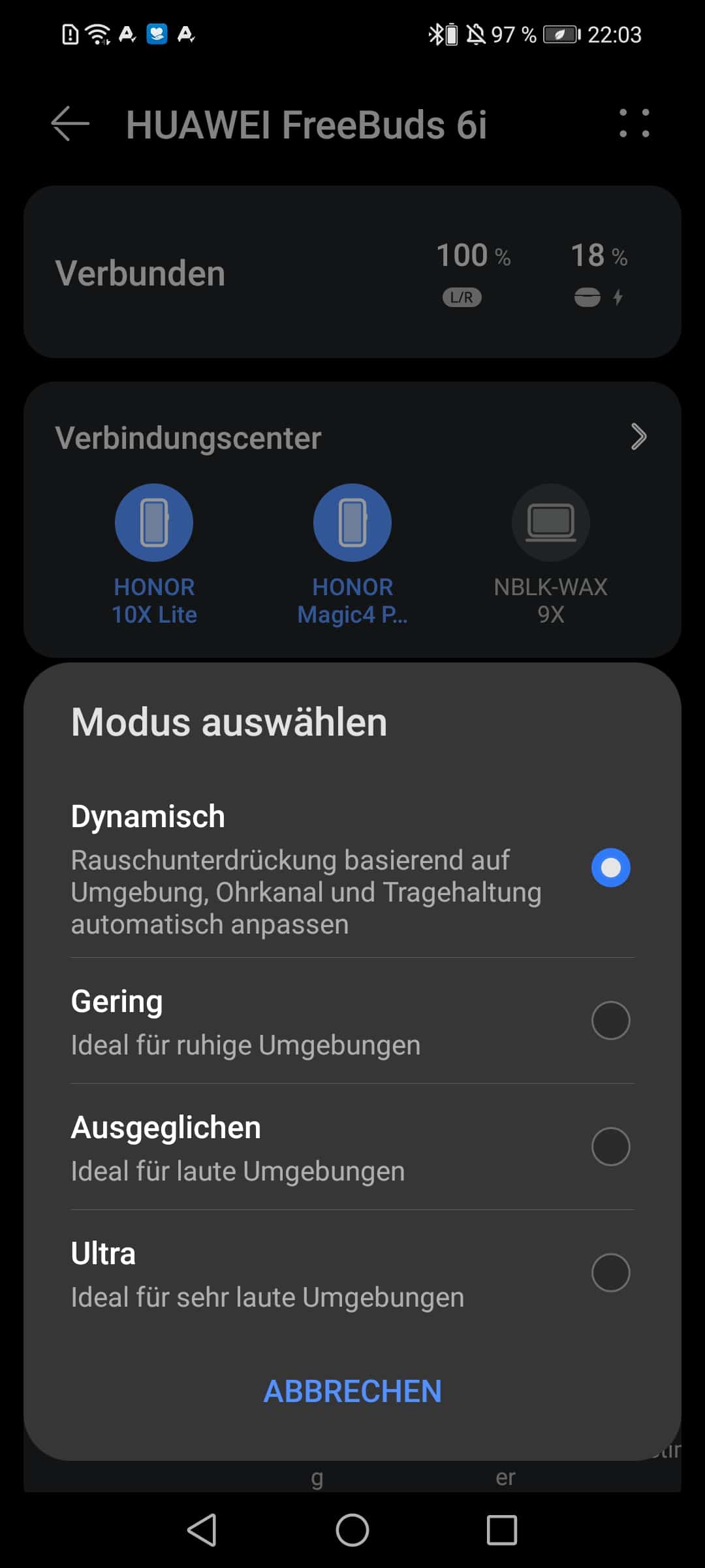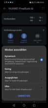 Die AI Life App ist einfach zu bedienen. Nach der Einrichtung auf einem meiner Testtelefone wurden die Huawei FreeBuds 6i erkannt und ein bereitstehendes Softwareupdate installiert. Über die App ist somit auch eine genaue Kontrolle der Akkustände, sowohl bei den FreeBuds 6i selbst und darüber hinaus auch vom Ladestand des Cases möglich. Weiterhin gibt es diverse Einstellungsmöglichkeiten sowohl für den Klang der Huawei FreeBuds 6i aber auch der Modus des ANC ist über die App steuerbar. Es kann zwischen den Modi Dynamisch (Rauschunterdrückung basierend auf der Umgebung), Gering, Ausgeglichen sowie Ultra (ein Segen im ÖPNV) gewechselt werden. Anders als bei meinem Test der MiiBuds Play gibt es bei den Huawei FreeBuds 6i somit die volle Kontrolle, was ich sehr begrüße.