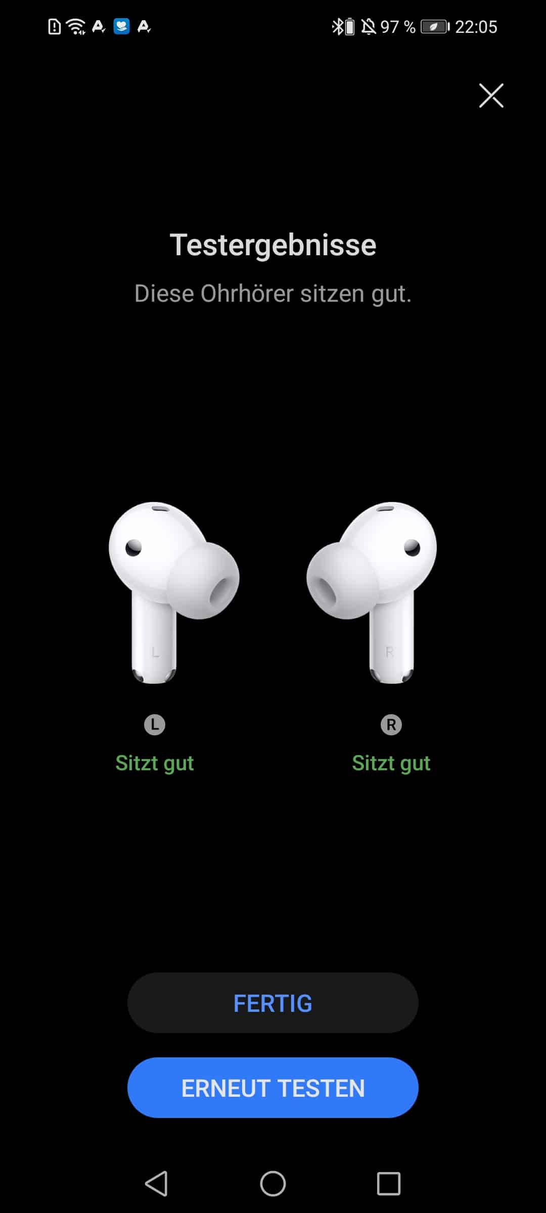 Sehr gut hat mir der Selbsttest über die AI Life App gefallen welcher den Sitz der Huawei FreeBuds 6i prüft.