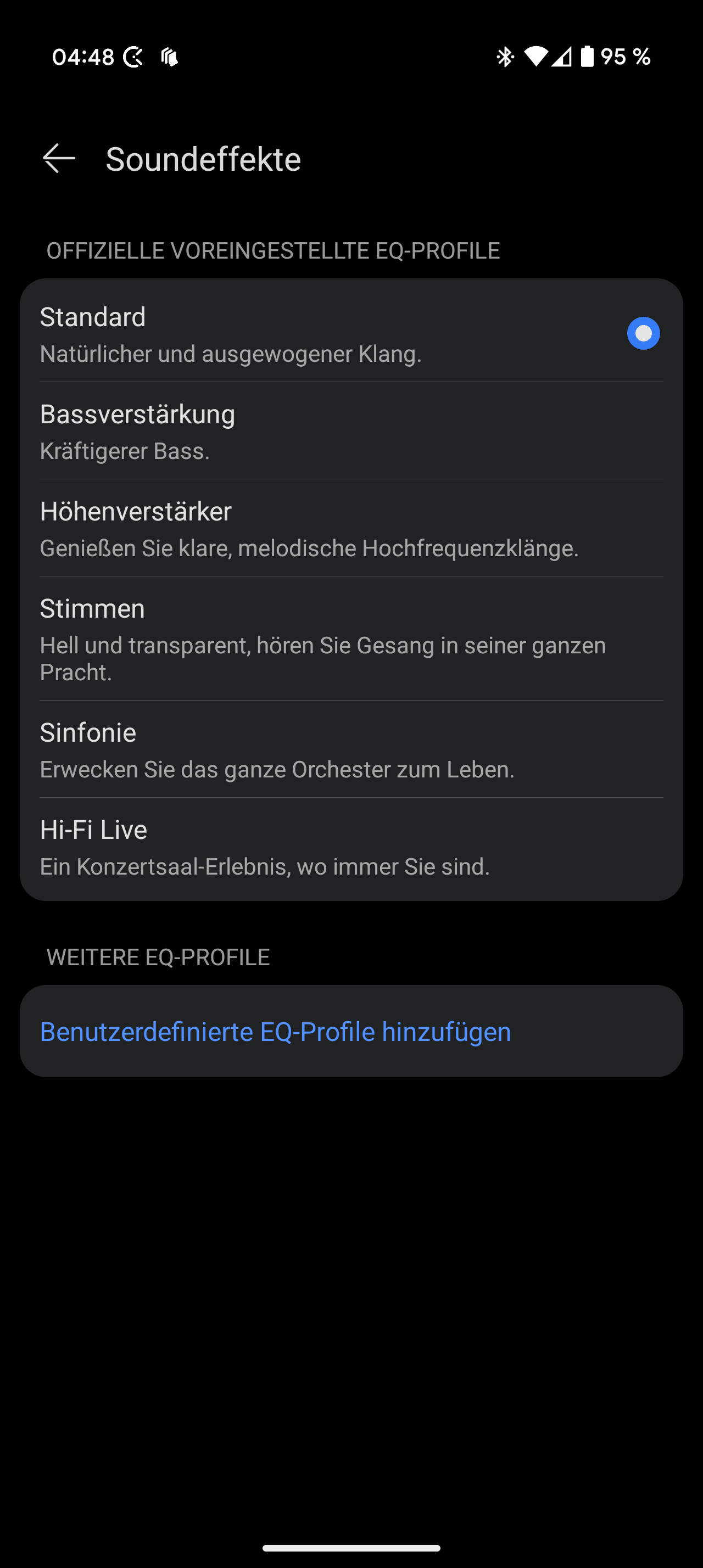 Neben Huawei AI Life werden die Huawei FreeBuds 7i auch über die Audio Connect-App bedient. Hier lassen sich unterschiedlichste Einstellungen in einem aufgeräumten Interface vornehmen. Beispielsweise passt du hier die räumliche Audiofuktion an oder wählst im Bereich „Soundeffekte“ zwischen verschiedenen Klangprofilen. Wer mag, erstellt sogar sein eigenes Equalizer-Preset.