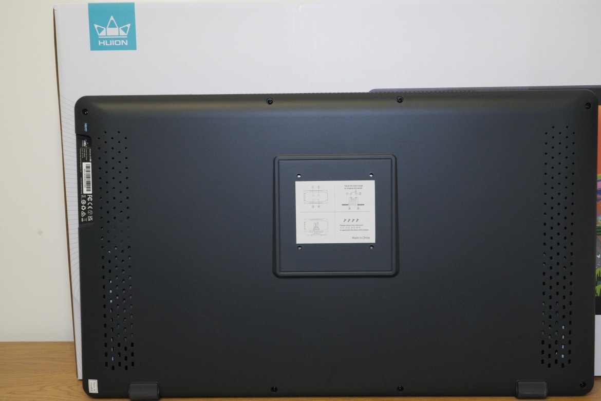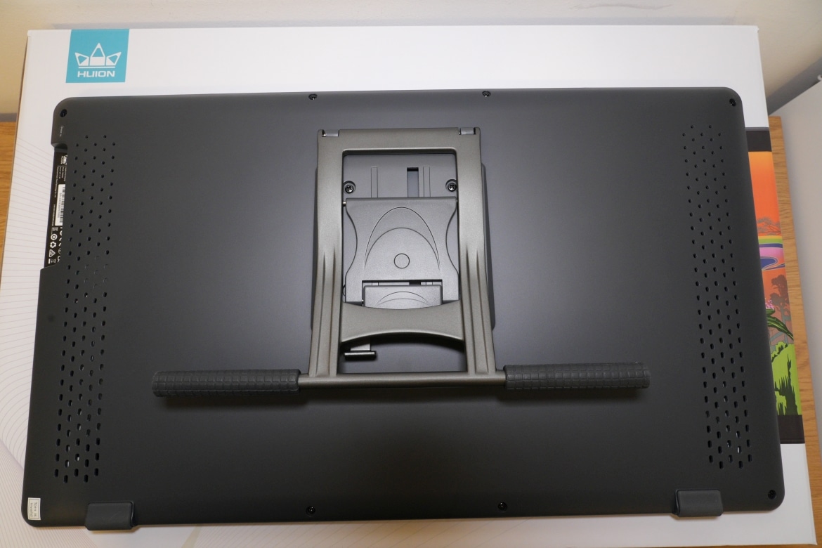 Bevor wir mit dem Huion Kamvas 22 loslegen können, will also erst einmal der Standfuß montiert werden. Das geht dank beiliegender Schrauben und Werkzeuge angenehm schnell und leicht. Der Standfuß wartet mit einer gummierten Unterseite auf, womit er auf sämtlichen Oberflächen sicheren Halt finden sollte.