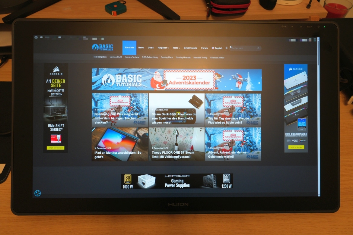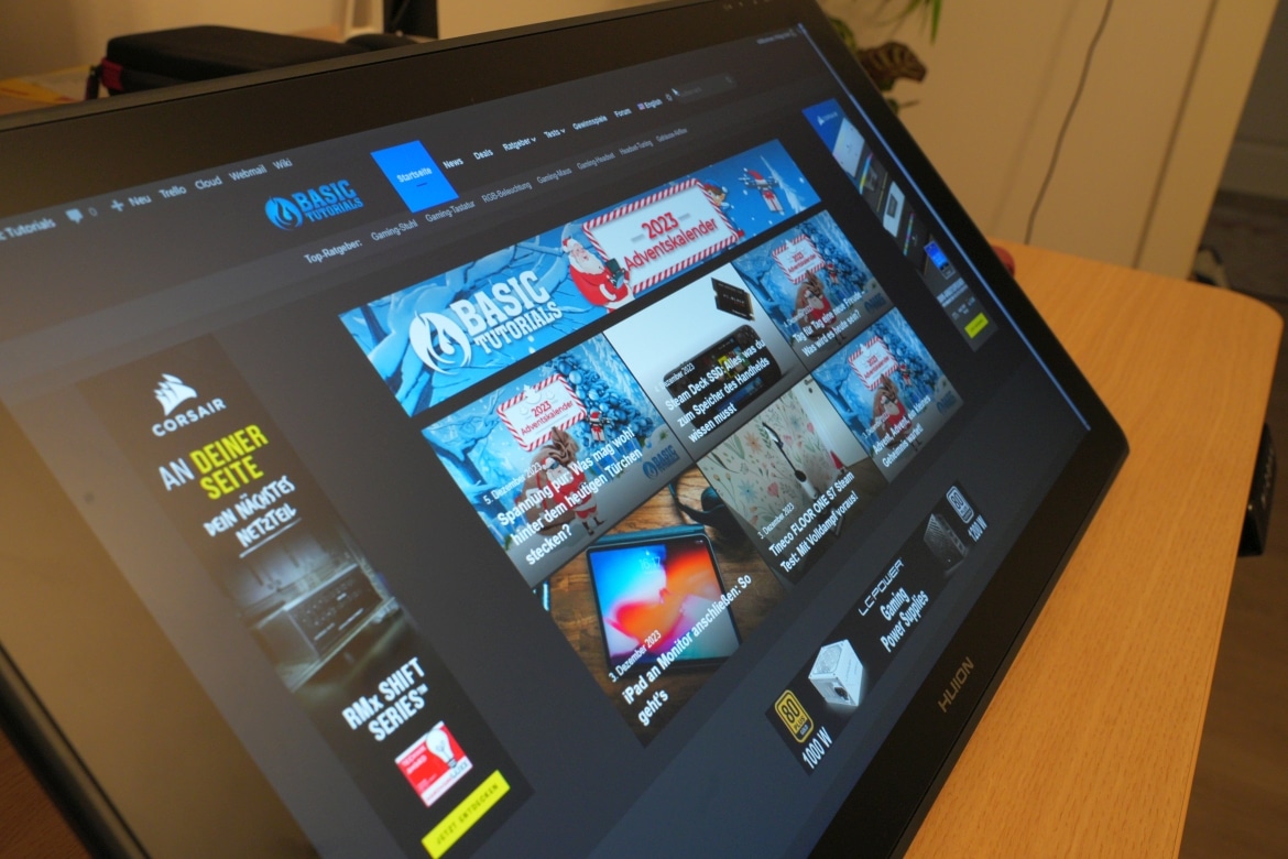 Bei der ersten Inbetriebnahme mangelte es dem Bild in meinen Augen leicht an Schärfe und Helligkeit, was sich aber durch wenige Handgriffe im Menü problemlos beheben lässt. Mit einer Spitzenhelligkeit von 220 cd/m² macht das Huion Kamvas 22 natürlich keinen hochwertigen Displays Konkurrenz, dank der entspiegelten und matten Oberfläche sind Inhalte aber auch unter direkter Sonneneinstrahlung sehr gut ablesbar.