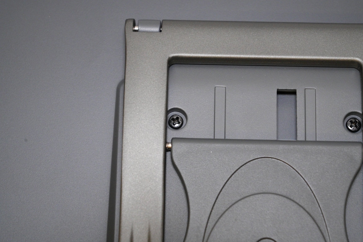 Mit insgesamt sieben Kreuzschlitz-Schrauben sind Vorder- und Rückseite miteinander verbunden. Hinten will zunächst der Standfuß montiert werden. Innensechskantschlüssel und die vier notwendigen Schrauben befinden sich im Lieferumfang.