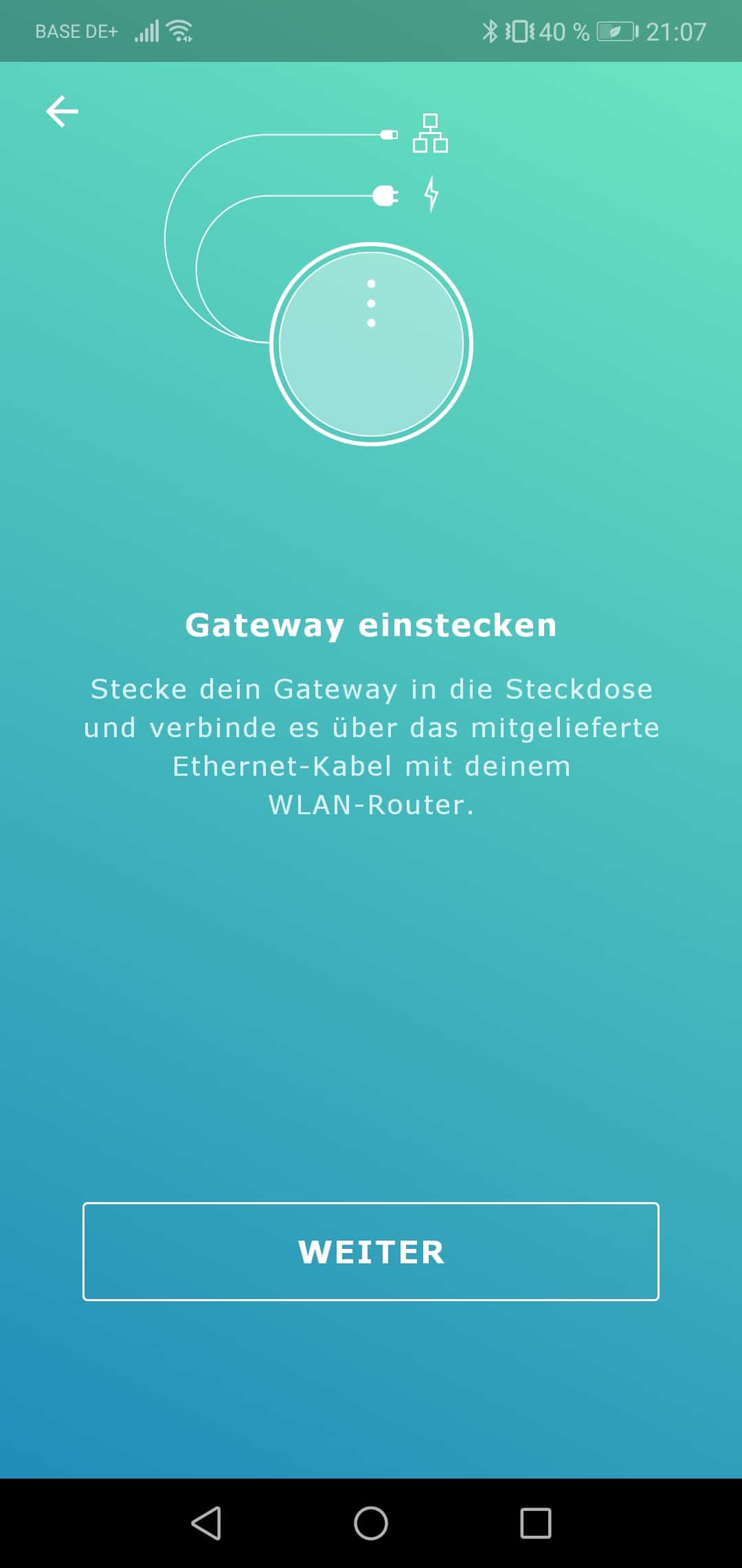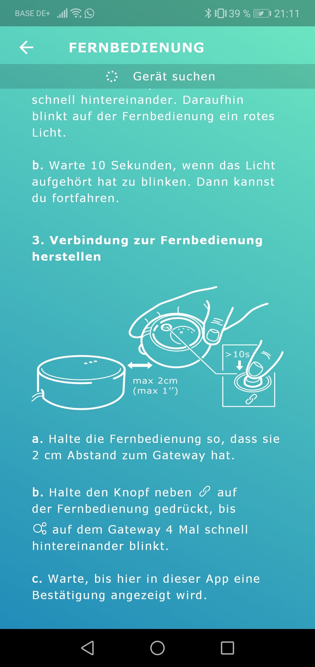 Die Einrichtung ist ebenso denkbar einfach. Wir laden uns die iOS- oder Android-App aus dem jeweiligen Store herunter und folgen der schön bebilderten Anleitung zum Verbinden mit dem Gateway. Wie in der Anleitung beschrieben, wird erst einmal die Fernbedienung verbunden, selbstverständlich wieder über die Pairing-Taste. Dieses mal muss sie aber auf beiden Geräten gedrückt werden. Um die App schlussendlich mit dem Gateway zu verbinden, befindet sich auf der Rückseite ein QR-Core, der eingescannt wird.