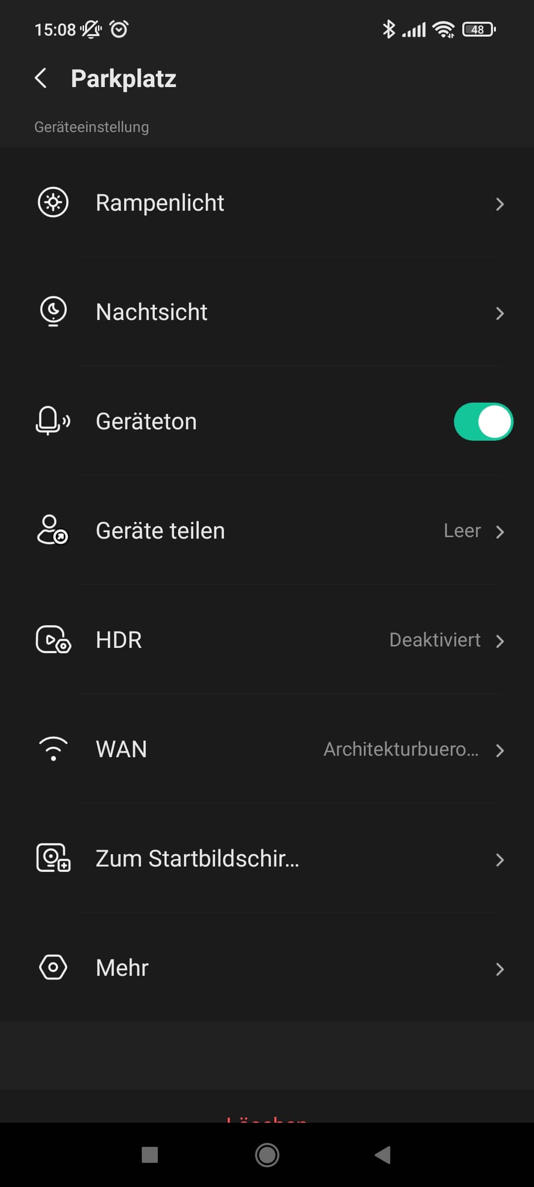 Ebenso ist es möglich die Nachtsicht anzupassen. Es gibt die Möglichkeit bei erkannten Bewegungen den Scheinwerfer angehen zu lassen. Alternativ kann auch nur der Infrarot-Strahler verwendetet werden. Hierbei handelt sich aber nicht um einen diskreten Strahler, ein rotes Licht an der Kamera ist somit immer sichtbar.