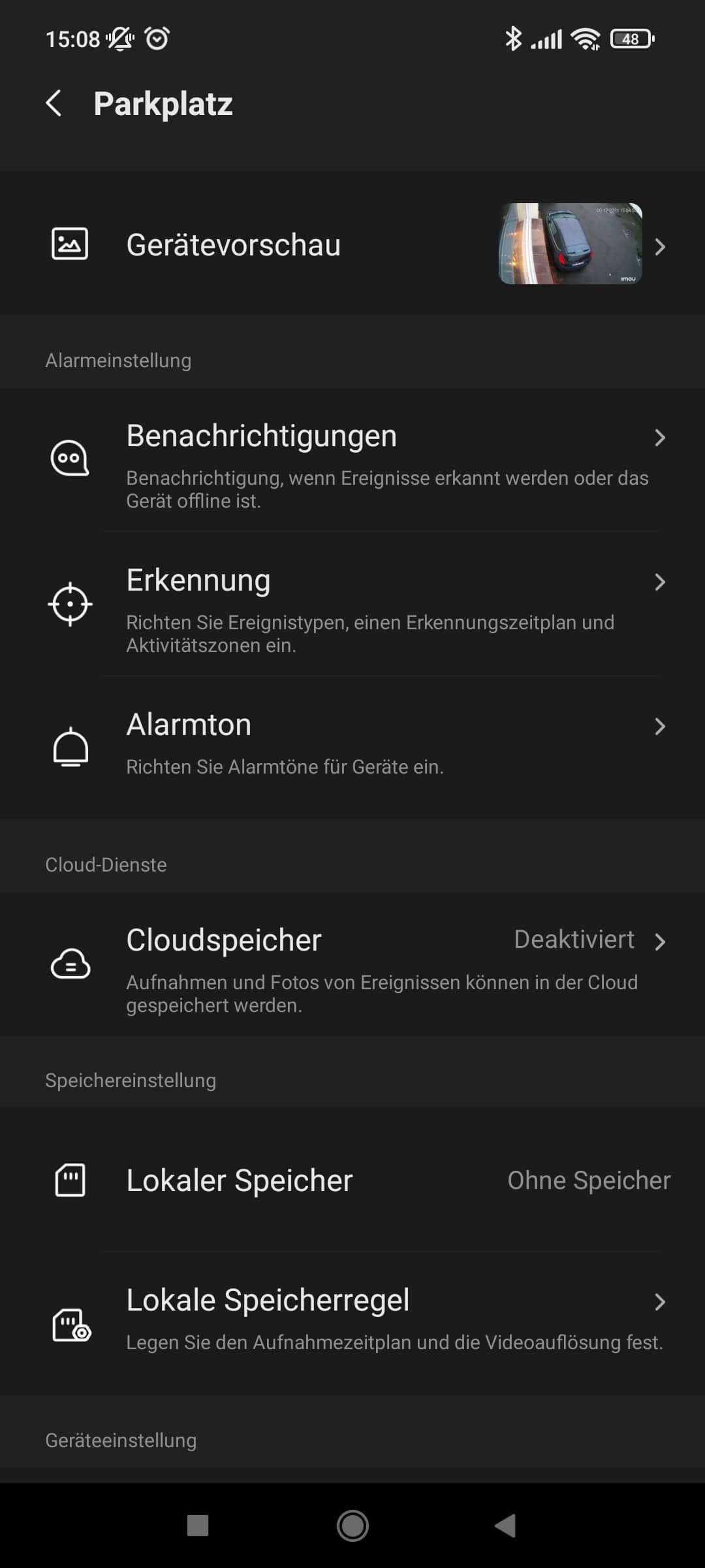 IMOU bietet bei der Bullet 2 drei verschiedene Möglichkeiten zur Speicherung von Videoaufnahmen an. Zum einen kann eine SD-Karte mit bis zu 256 GB verwendet werden. Eine andere Möglichkeit ist der Cloudspeicher des Herstellers, natürlich für einen monatlichen Preis. Zu Beginn erhaltet ihr zwar einen Testzeitraum, eine SD-Karte würde ich immer noch präferieren. Die letzte Möglichkeit ist ein Aufnahmegerät (NVR), wie beispielsweise ein Synology NAS. Dort kann die Kamera per ONVIF eingebunden und verwendet werden.