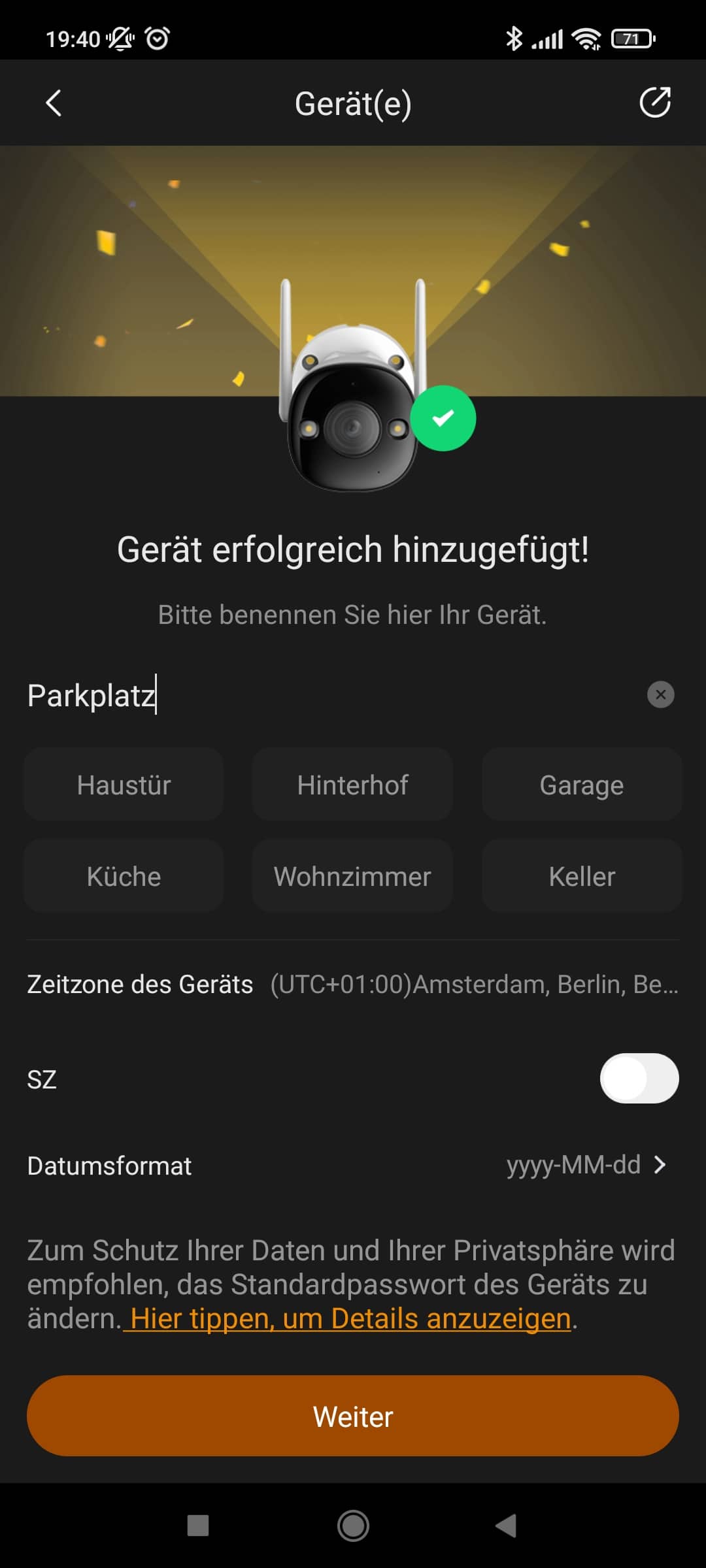 Nach der Eingabe soll eine Verbindung mit eurem WLAN hergestellt werden. Der Netzwerkname wird einfach aus der bestehenden Verbindung genommen, das Passwort ist einzutragen. Die Bullet 2 verwendet ausschließlich das 2,4-GHz-Netz, wünschenswert wäre noch 5 GHz. Ausreichend Bandbreite dürfte in diesem Netz aber zur Verfügung stehen. Im Anschluss vergeben wir einen Namen für die Kamera. Werden mehrere Kameras des Herstellers verwendet, ist das sicher sinnvoll. Zeitzone sowie das Datumsformat können wir zum Schluss auch noch festlegen.