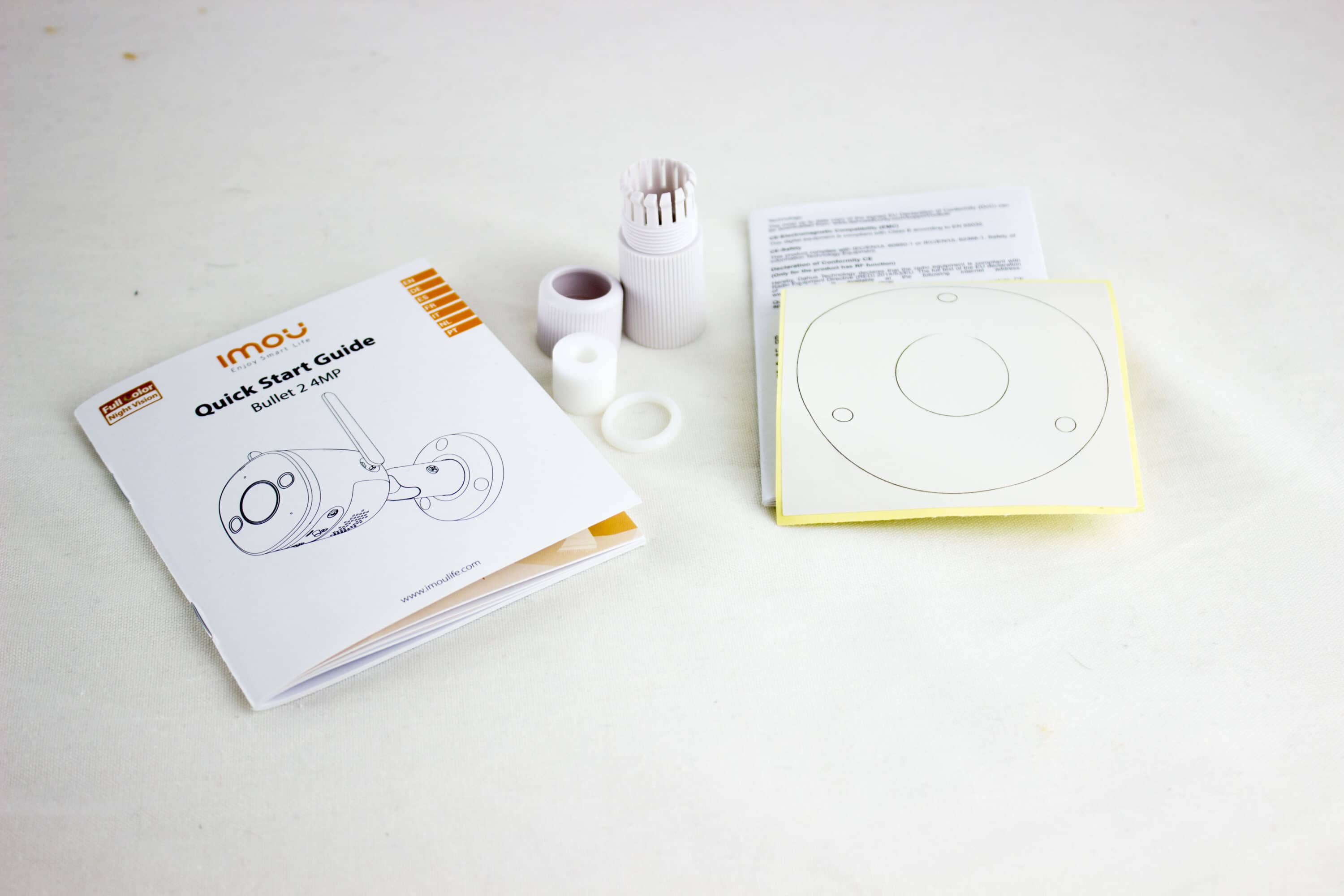 IMOU legt uns das notwendige Montagematerial direkt bei der Kamera dazu. Mit der beiliegenden Schablone lassen sich auf die Bohrlöcher einfach anzeichnen, um die Montage vorzubereiten. Leider das Gelenk das Halters und die Kabeldurchführung ungünstig angebracht. Soll die Kamera nach unten ausgerichtet werden, muss das Kabel nach oben rausgeführt werden.