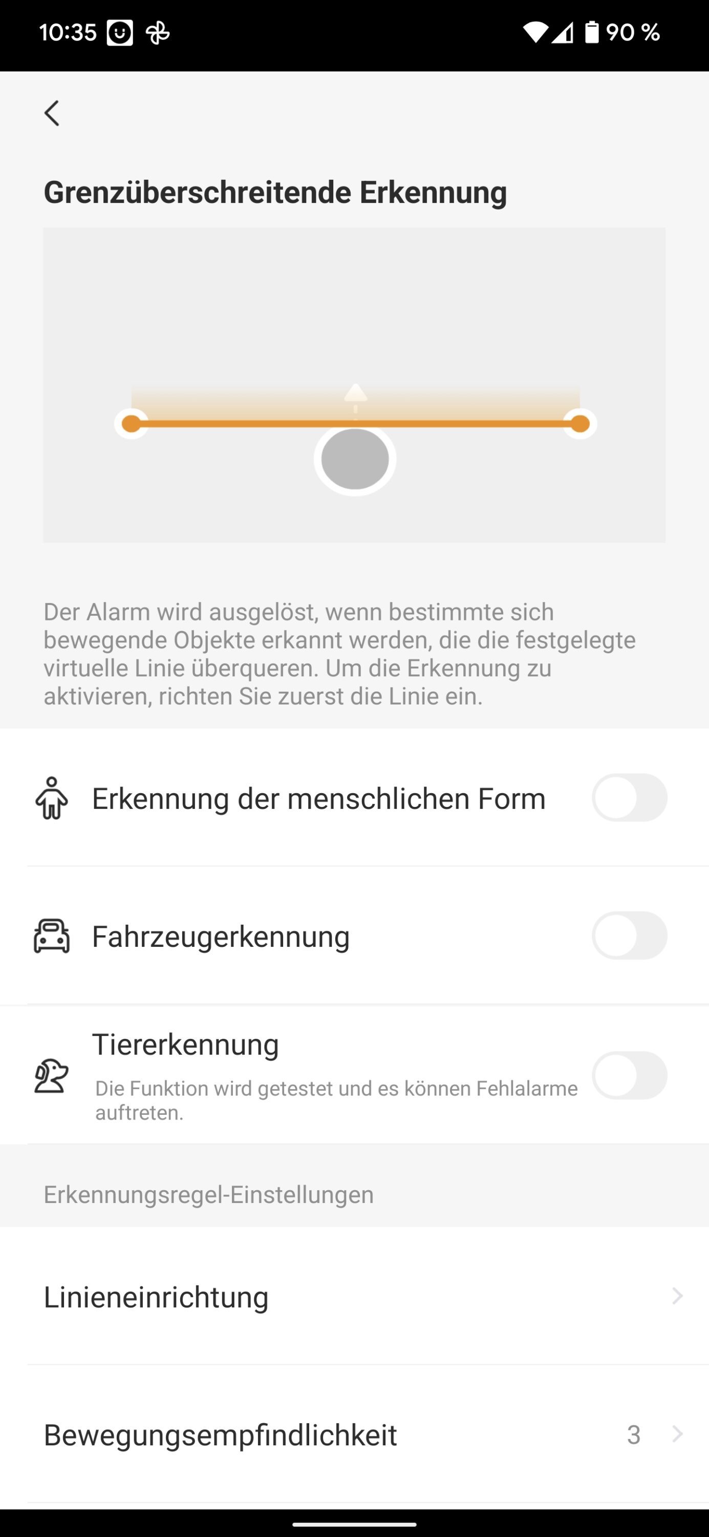 In der Praxis klappt das sogar bei Tieren tadellos. Zumindest, nachdem die diese Funktion innerhalb der App hinzugeschaltet hast. Ansonsten lässt der Funktionsumfang keinerlei Wünsche offen. Du kannst Bereichszonen vorgeben, in denen die Kamera Alarme bei Bewegungen ausspielt oder sogar eine Grenzlinie, die selbiges tut, sobald diese überschritten wurde.