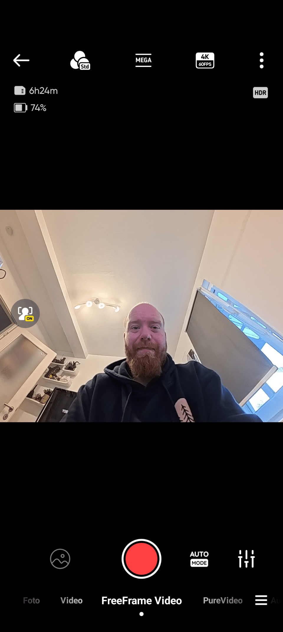Ein Wischen von links nach rechts öffnet das Fotoalbum, in dem Bilder und Videos zu finden sind, während ihr mit einer Wischbewegung von unten nach oben zu den Bildeinstellungen gelangt, in denen ihr unter anderem die Auflösung, Bildrate, Stabilisierung und vieles mehr anpassen könnt.