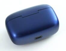 Auch das Ladeetui setzt durchgehend auf Kunststoff. Es wird zum Aufladen und zum Transport der Kopfhörer genutzt: Man kann es aufklappen und die Kopfhörer in die eingelassenen Slots setzen. Das Laden erfolgt dabei durch jeweils drei Metallkontakte, die an den entsprechenden Kontaktflächen der Kopfhörer aufliegen.