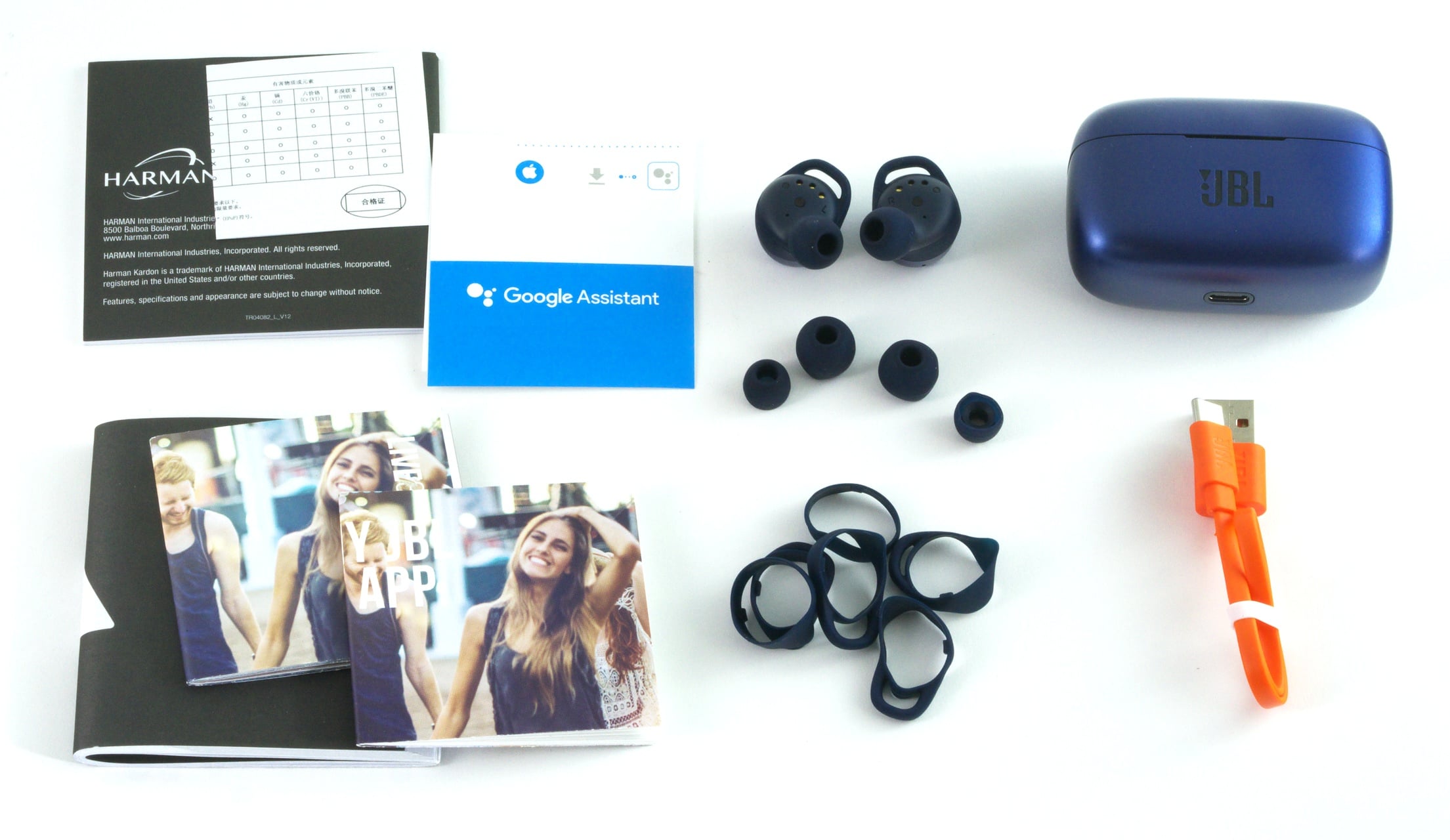 Die Live 300 TWS werden mit einigem Zubehör ausgeliefert. Neben den Kopfhörer selbst legt JBL Silikonaufsätze in drei Größen sowie zusätzliche Silikonringe in vier Größen bei, durch die sich die Kopfhörer anpassen lassen. Dazu gibt es das besagte Ladeetui, ein kurzes USB-C-Ladekabel und diverse Anleitungen.