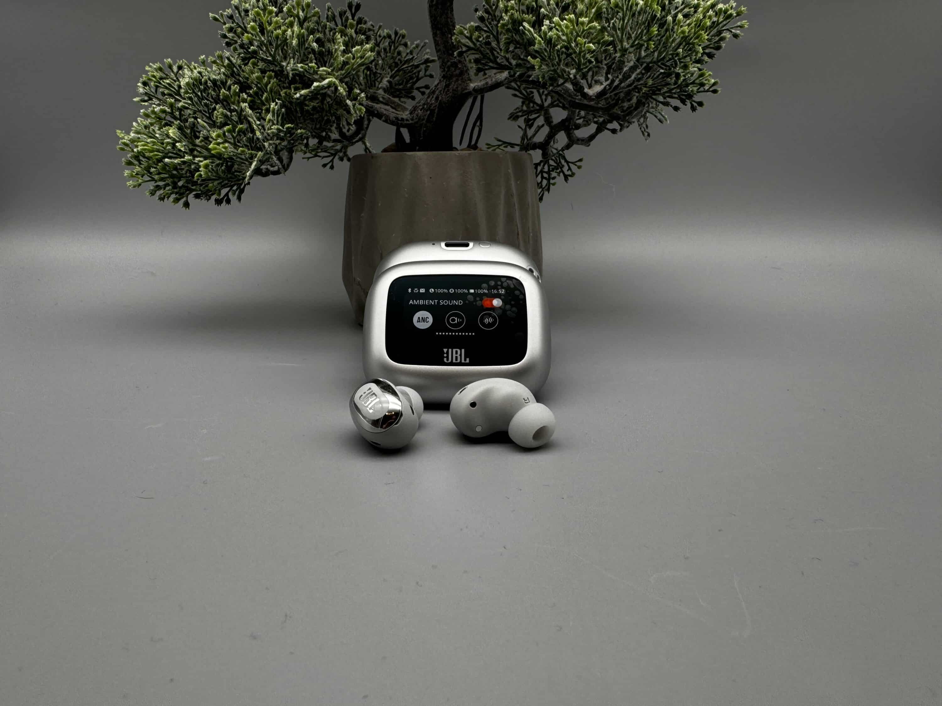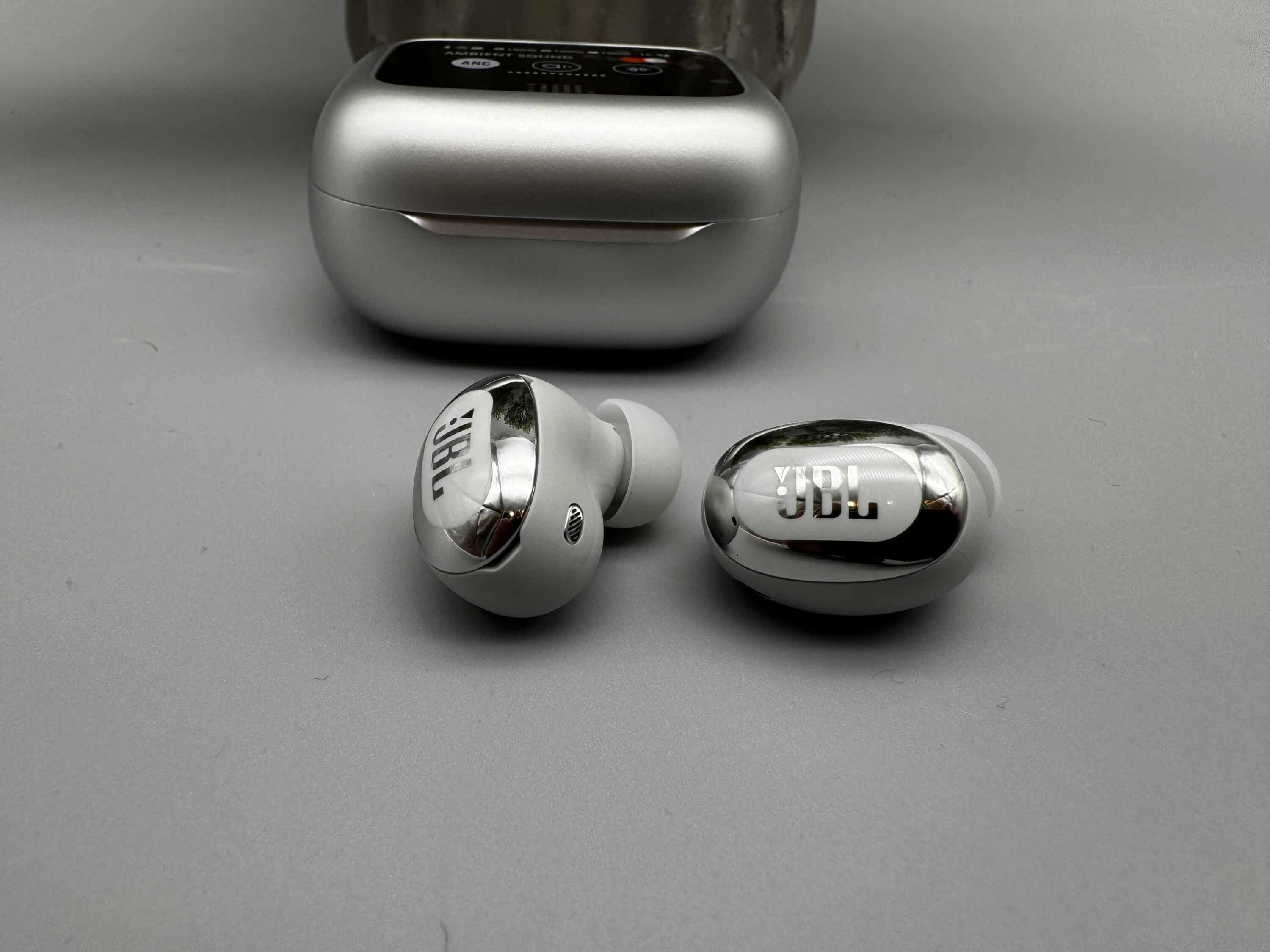 Die Earbuds selbst fallen mit 4,6 Gramm pro Stück ebenfalls etwas leichter aus und kommen mit einem Look ohne Stift daher. Das angenehm dezente, hellgraue und matte Auftreten kombiniert JBL mit silberfarbenen Akzenten, was für eine stilvolle Optik sorgt.