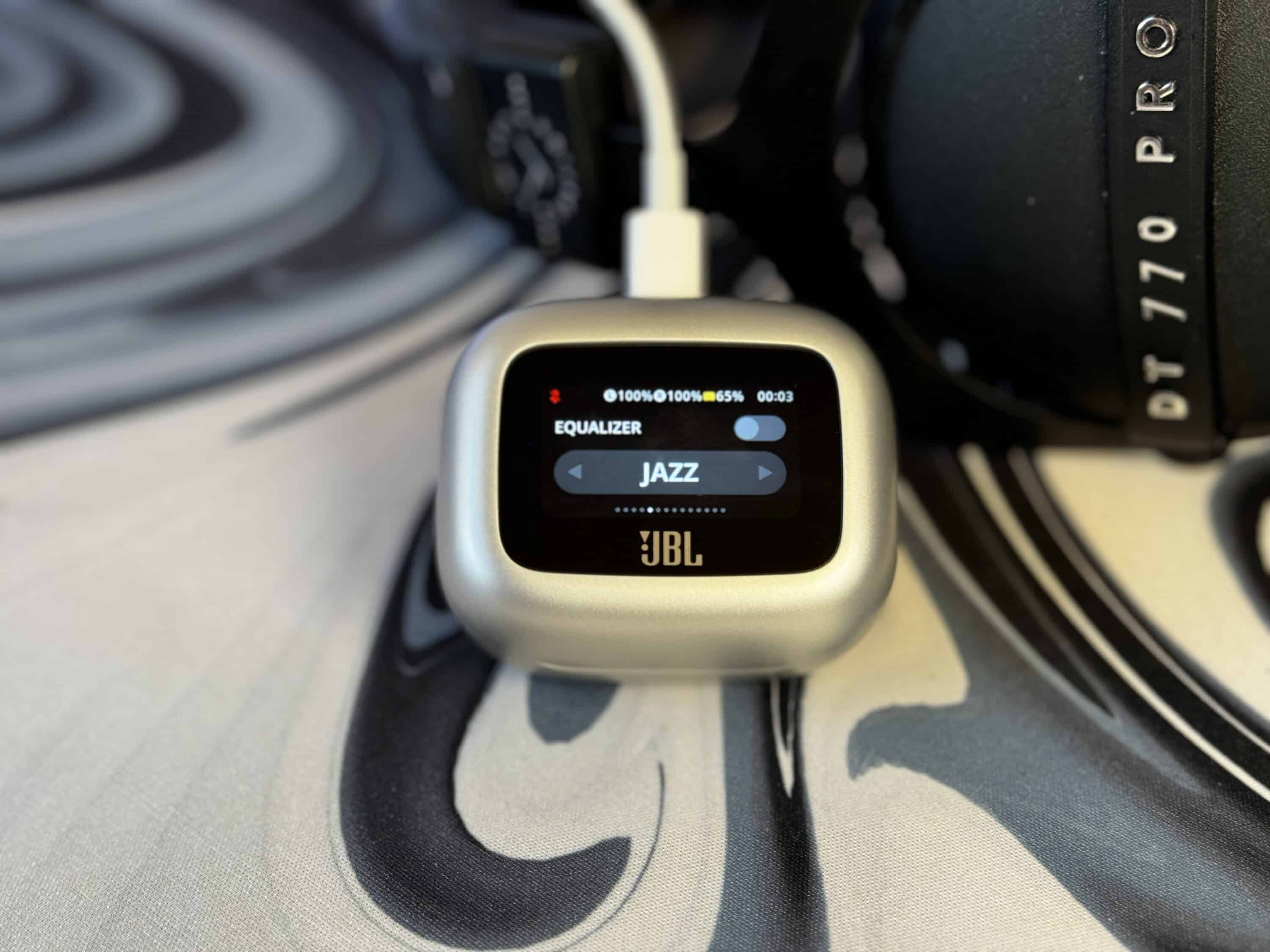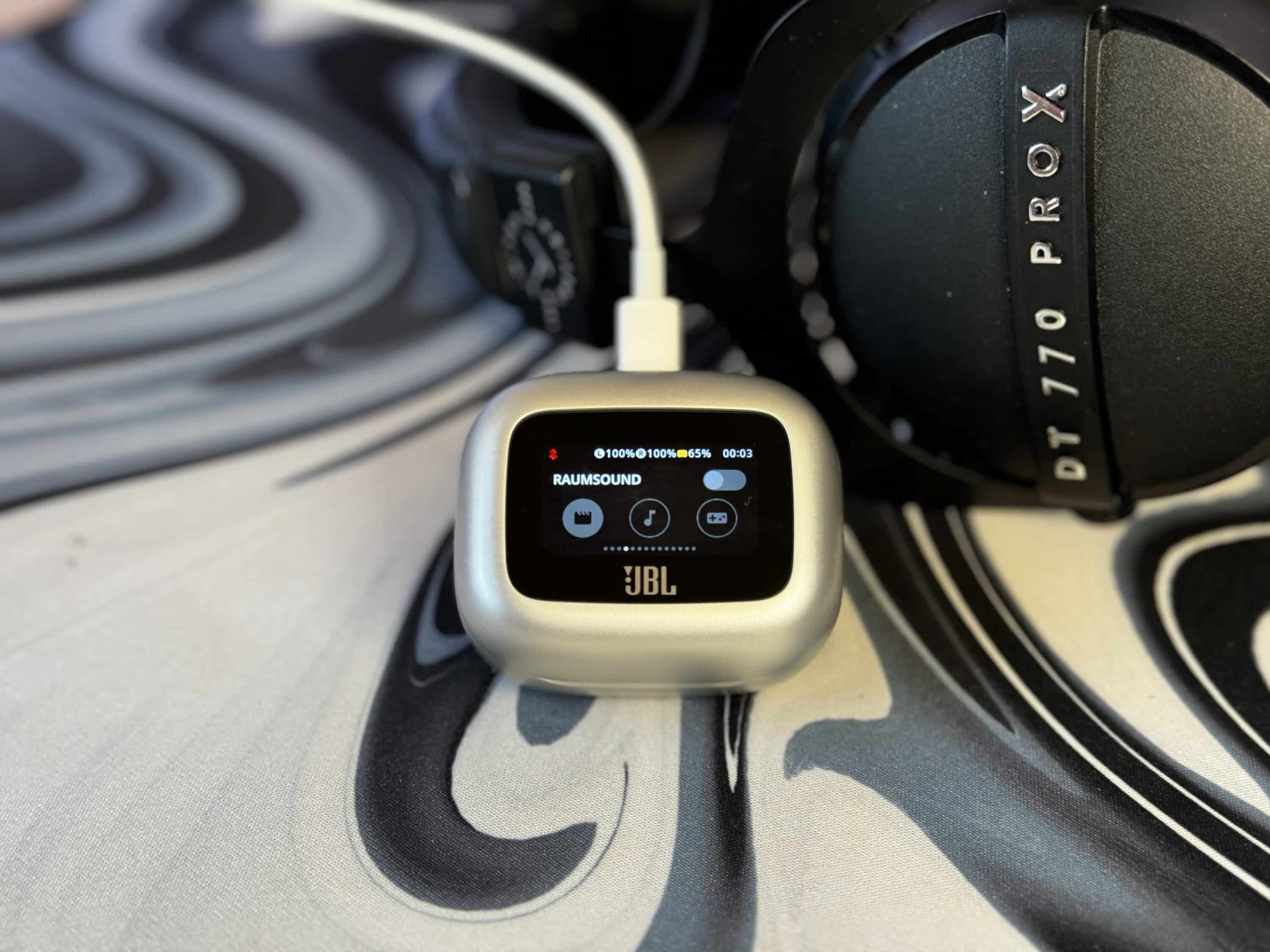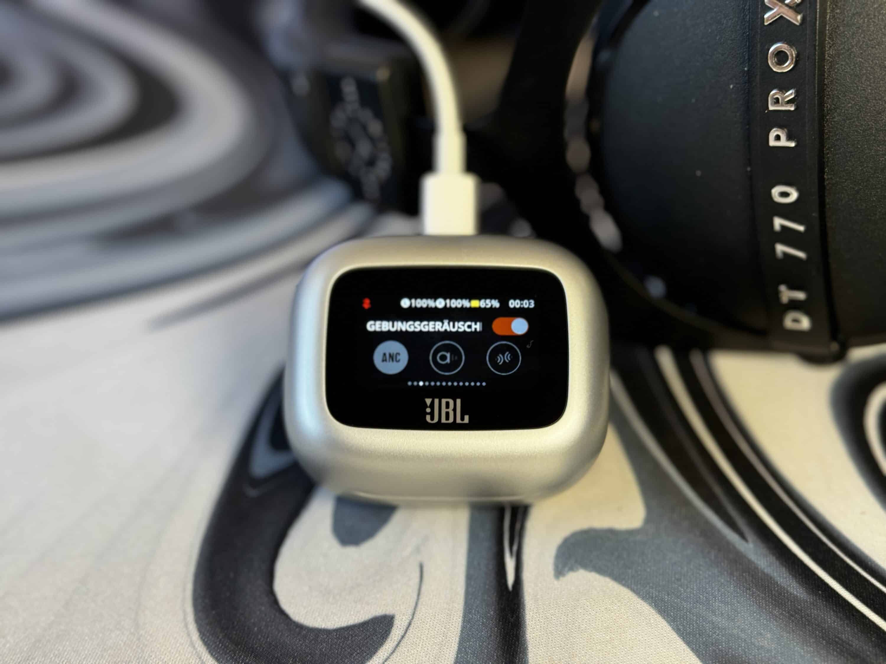 Eine Besonderheit der JBL Live Buds 3 ist natürlich das Ladecase, genannt „Smart Charging Case“, das mit einem 1,45 Zoll großen Touchscreen aufwartet. Und das erweist sich in der Praxis als wirklich nützlich, da sich hier fast alle Einstellungen der Earbuds direkt am Case vornehmen lassen. Das Case ist bei der gesamten Live 3-Reihe dasselbe.
