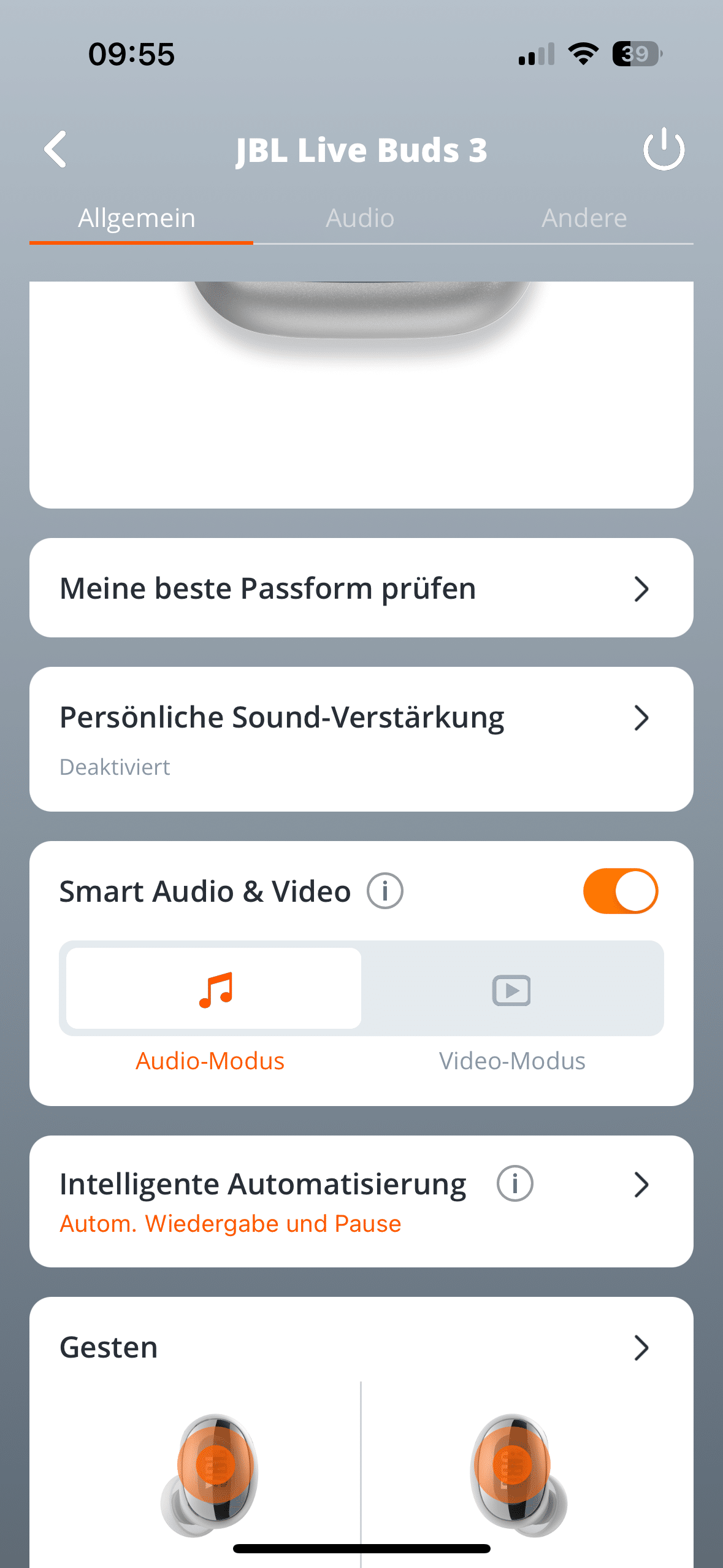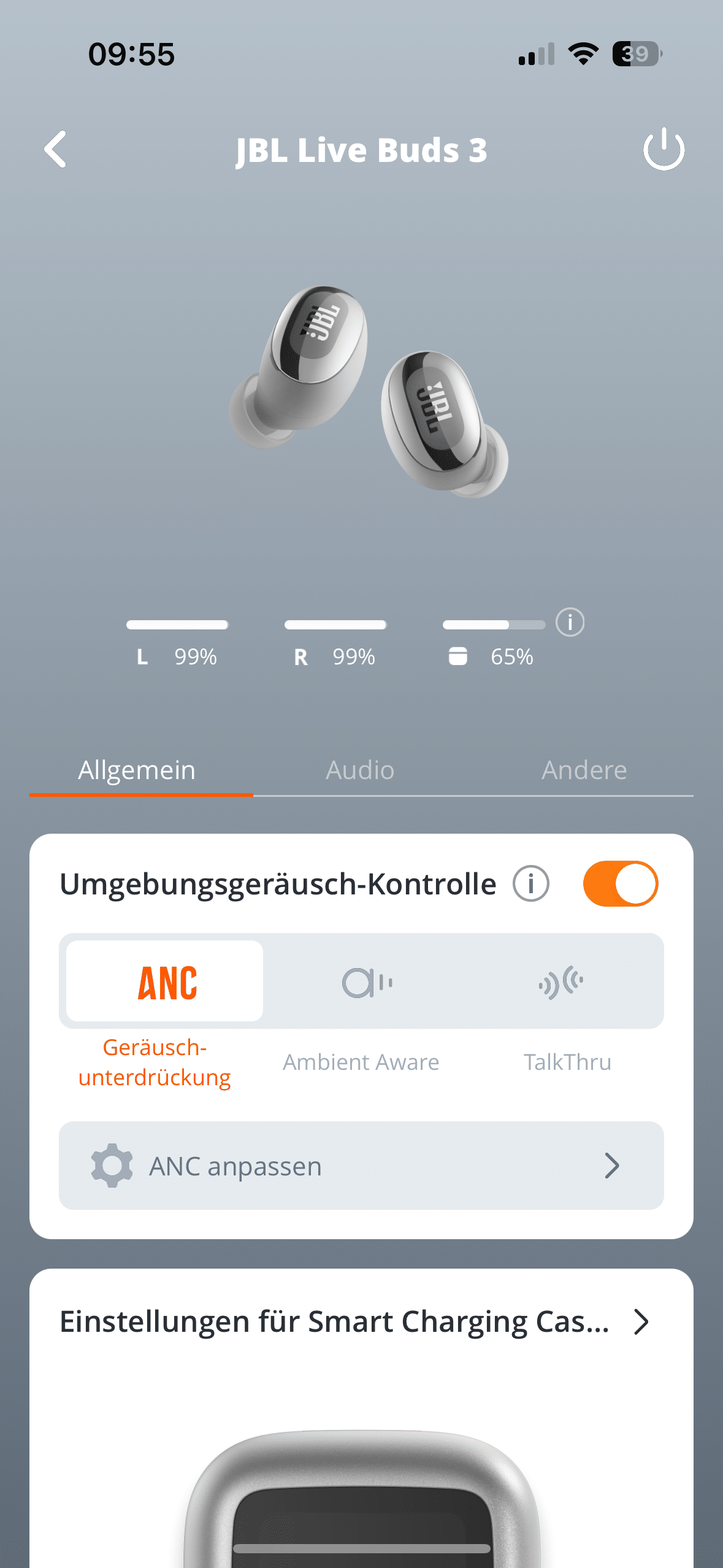 Das Praktische dabei ist natürlich, dass das Case all die Optionen realisiert, die normalerweise in der Smartphone-App zu finden sind. Die gibt es, in Form der JBL Headphones-App, natürlich auch. Aber die Möglichkeit, alles direkt über das Case einzustellen, ist natürlich äußerst praktisch.