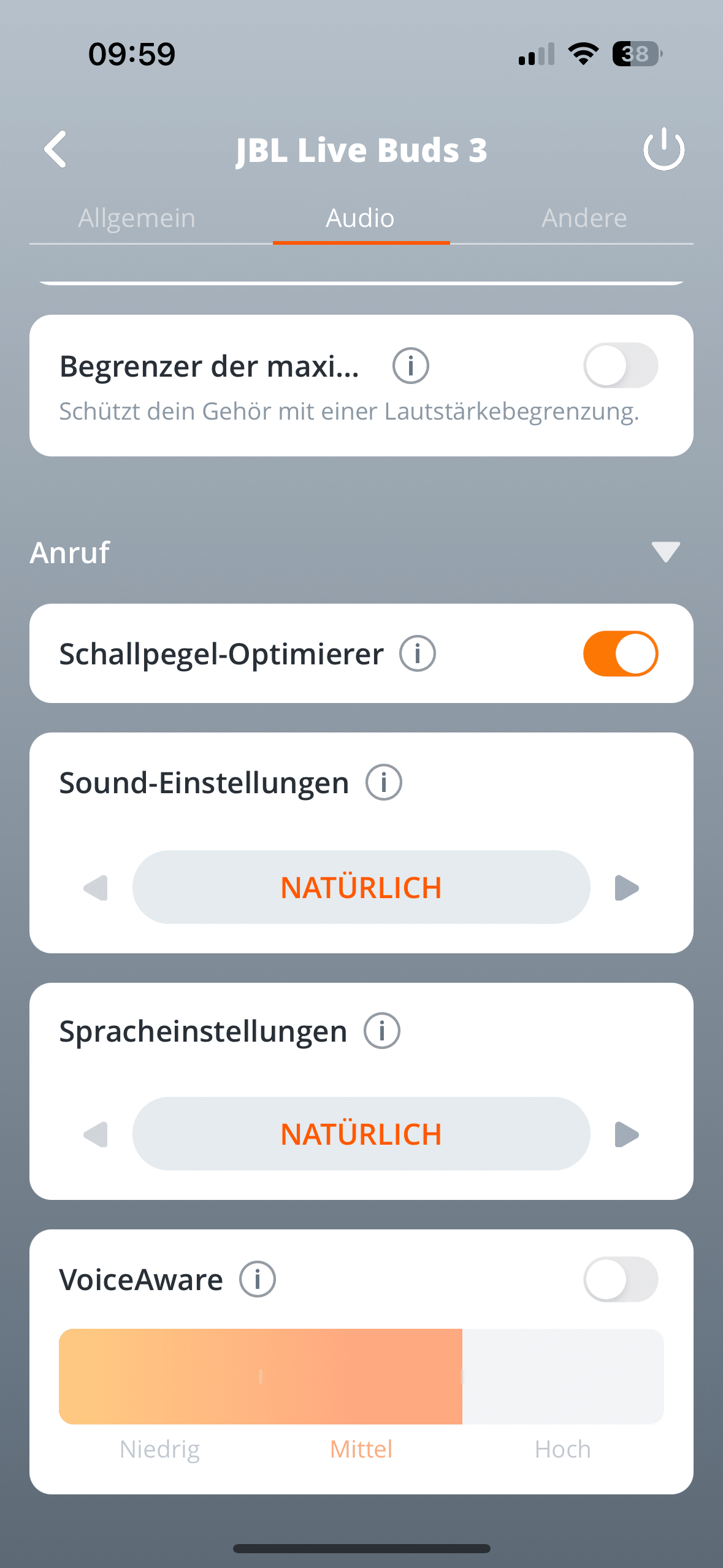 Die aktive Geräuschunterdrückung liegt ebenfalls auf recht gutem Niveau und arbeitet adaptiv. Passt sich also in Echtzeit an die Umgebungsgeräusch an. Wer das nicht mag, kann die adaptive Funktion aber auch deaktivieren, und das ANC selbst in insgesamt sieben Stufen festlegen.