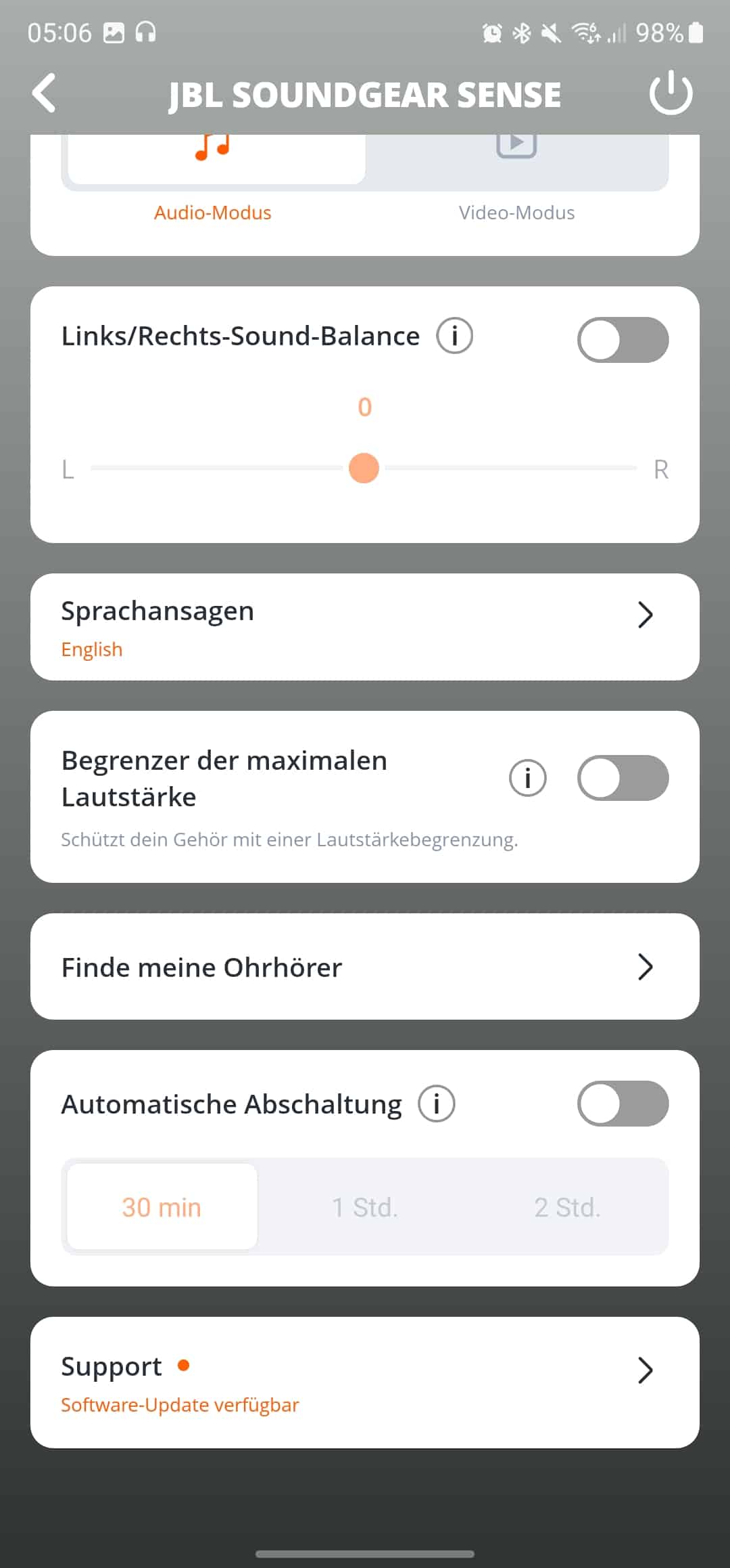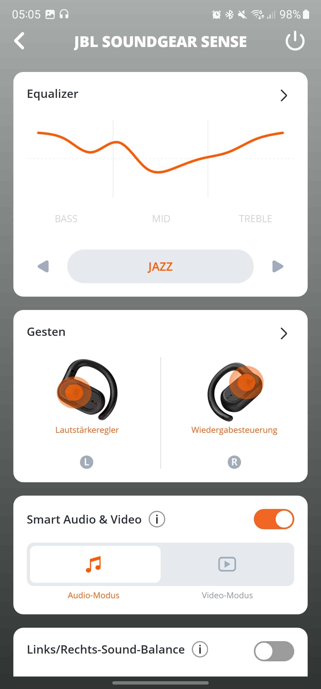 Der Menüpunkt „Finde meine Ohrhörer“ ist recht praktisch, funktioniert aber nur, wenn die JBL Soundgear Sense ohne Case in der Wohnung verlegt wurden. Denn hier gibt es kein GPS-Tracking, stattdessen wird nur ein (sehr lauter) Piepton wiedergegeben.