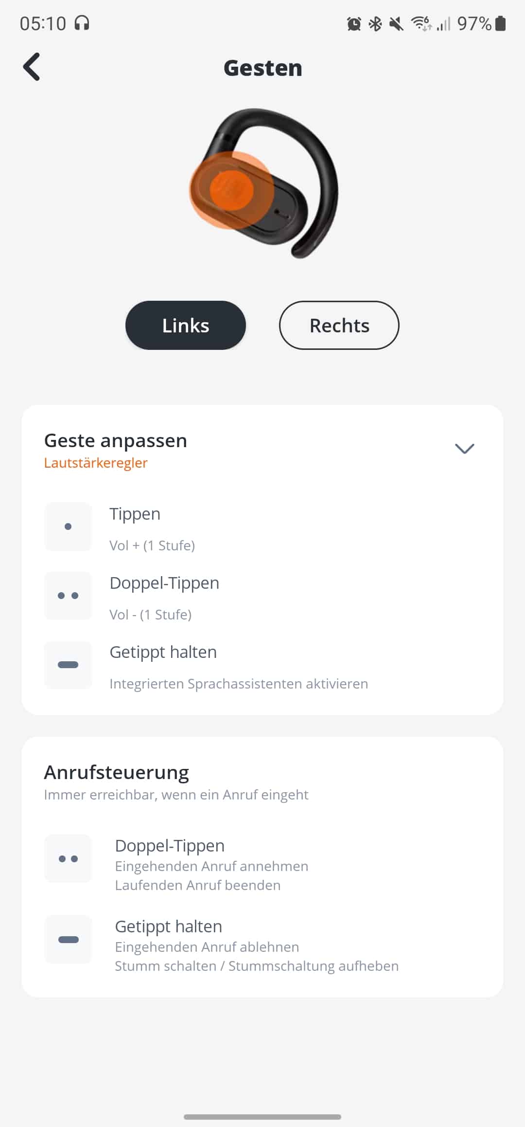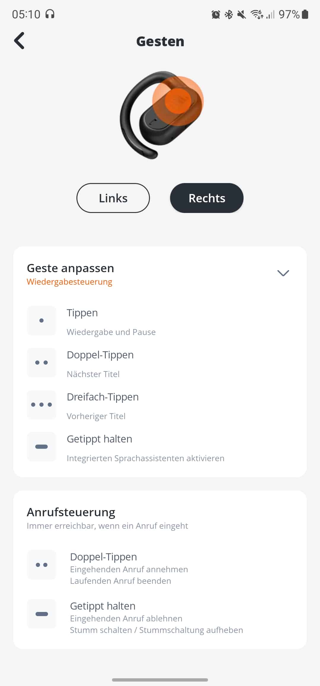Da hier aber beispielsweise nicht zwischen ANC, Transparenz- und normalem Modus gewechselt werden muss, ist die Bedienung deutlich weniger komplex als beispielsweise im Falle der Sony WF-1000XM5 (unser Test) – entsprechend vermissen wir hier keine Wischgesten oder ähnliches.