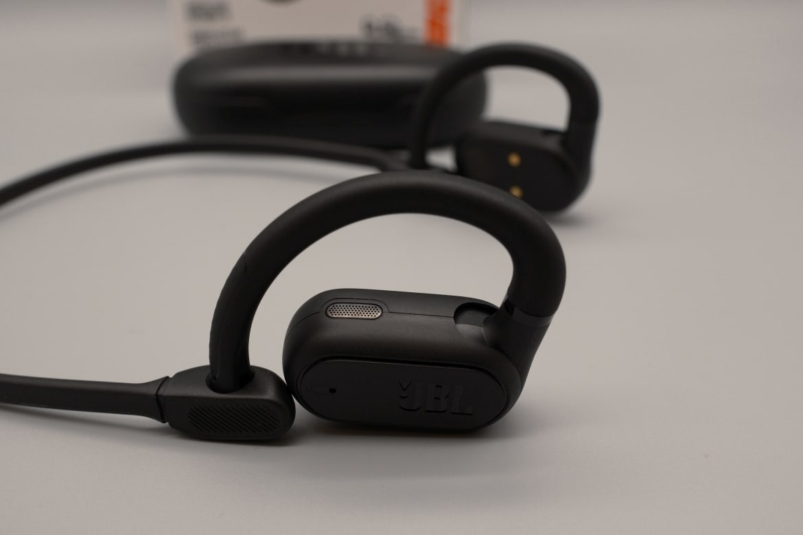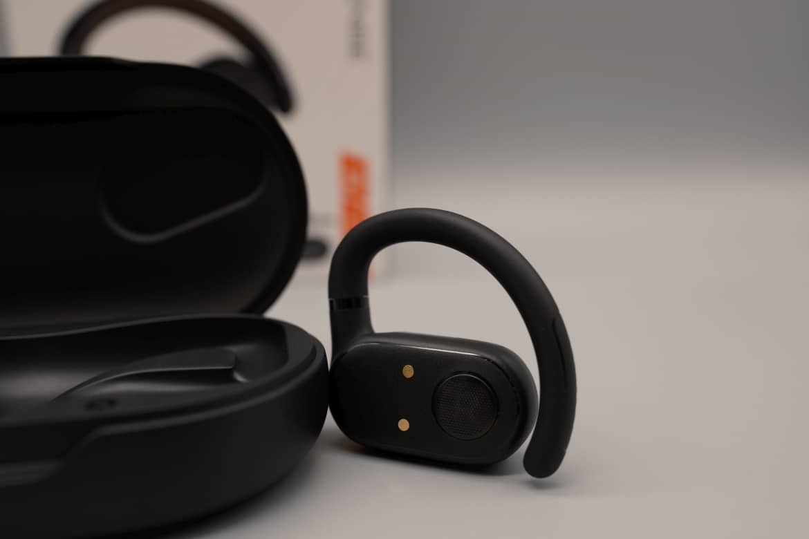 Zwei vergoldete Kontakte halten die Ohrhörer magnetisch im Ladecase. Da Die JBL Soundgear Sense natürlich nicht im Ohr Platz nehmen, befindet sich ein Bügel an beiden Ohrhörern. Dieser kann in drei Stufen verstellt werden, um den bestmöglichen Tragekomfort zu erreichen (dazu später mehr).