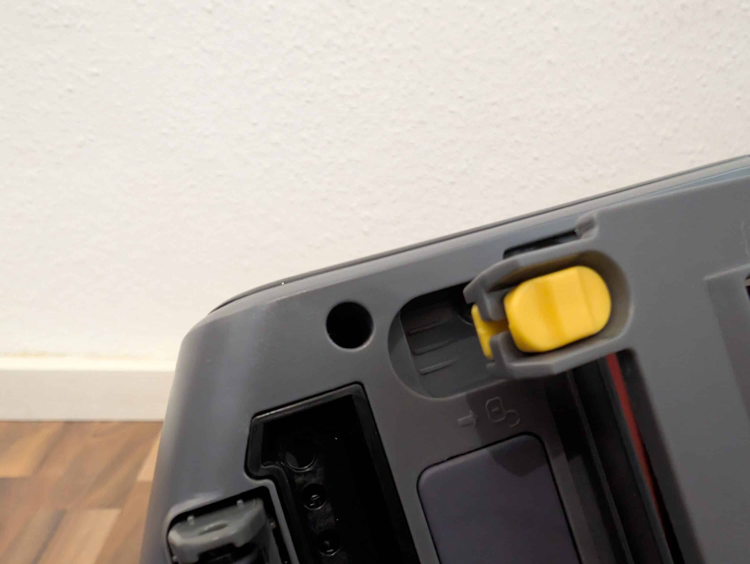 - Die Bürstenwalze lässt sich einfach herausnehmen – die beiden gelben Hebel links und rechts an der Unterseite des Bürstenkopfes entriegeln die Walze ohne Werkzeug