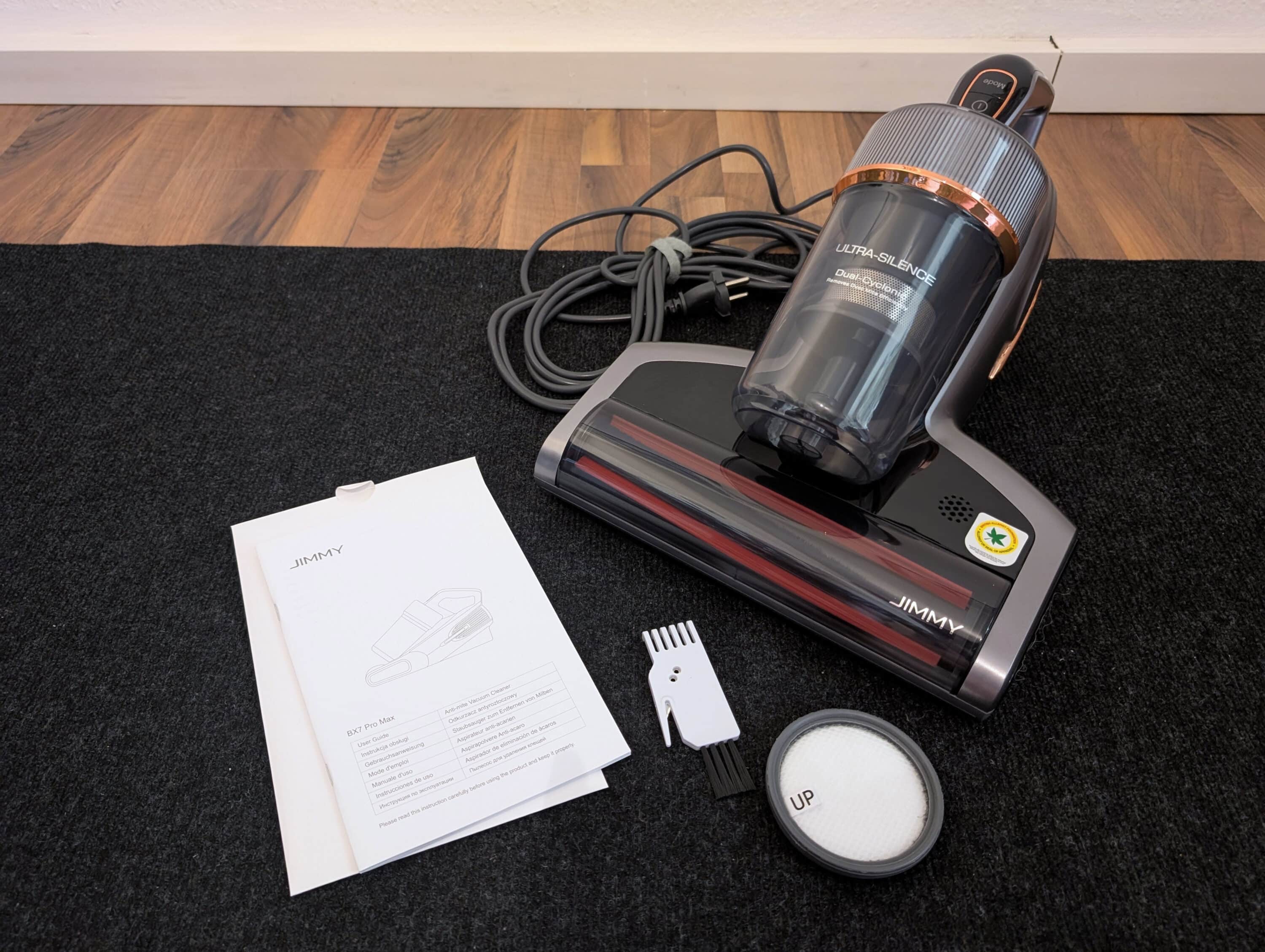 Jimmy liefert das Wesentliche mit: Hauptgerät, Ersatzfilter, Reinigungswerkzeug für die Bürstenwalze und eine mehrsprachige Anleitung. Der Karton ist übersichtlich gepackt, alles sitzt sicher an seinem Platz.