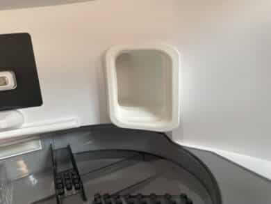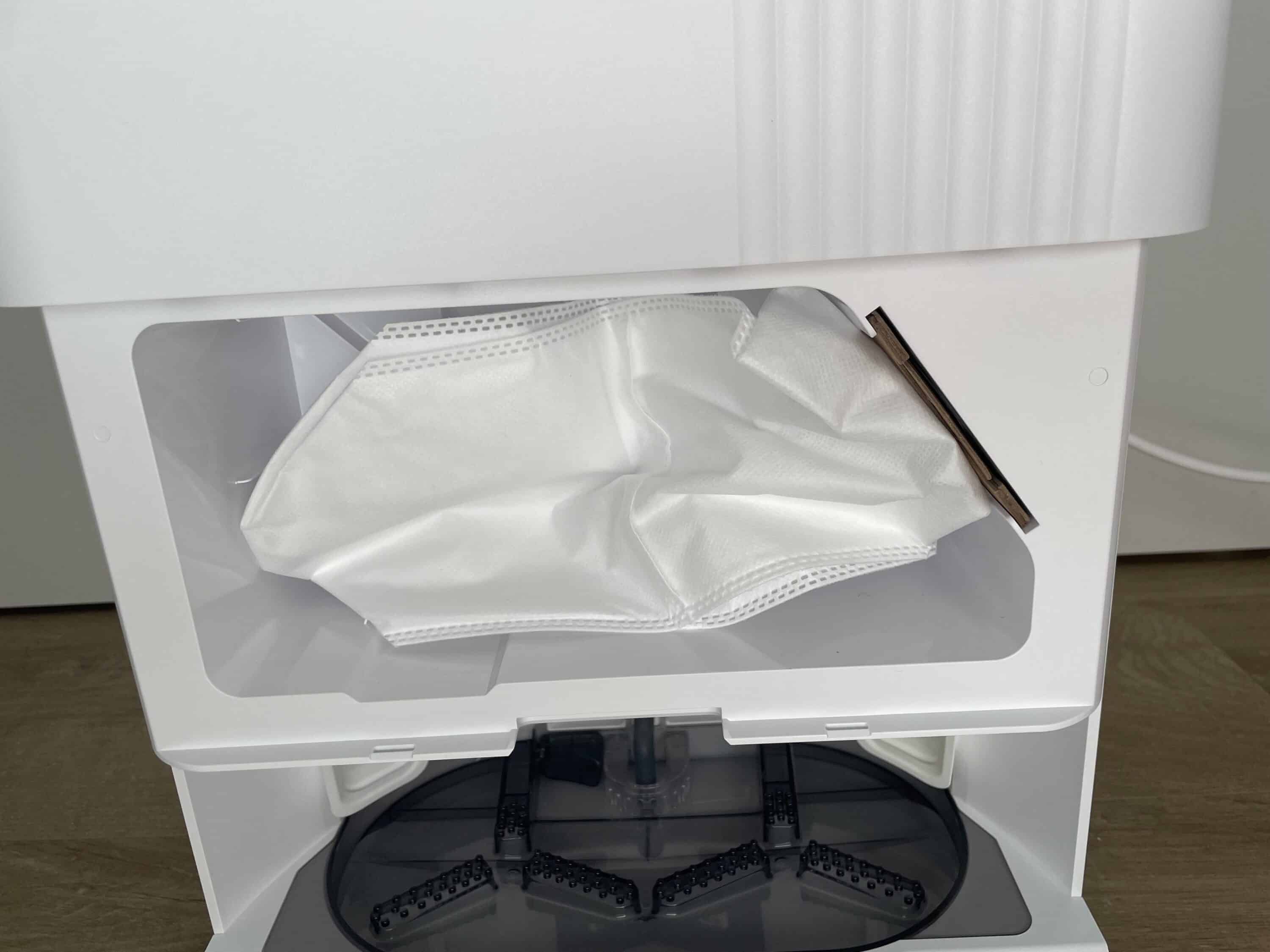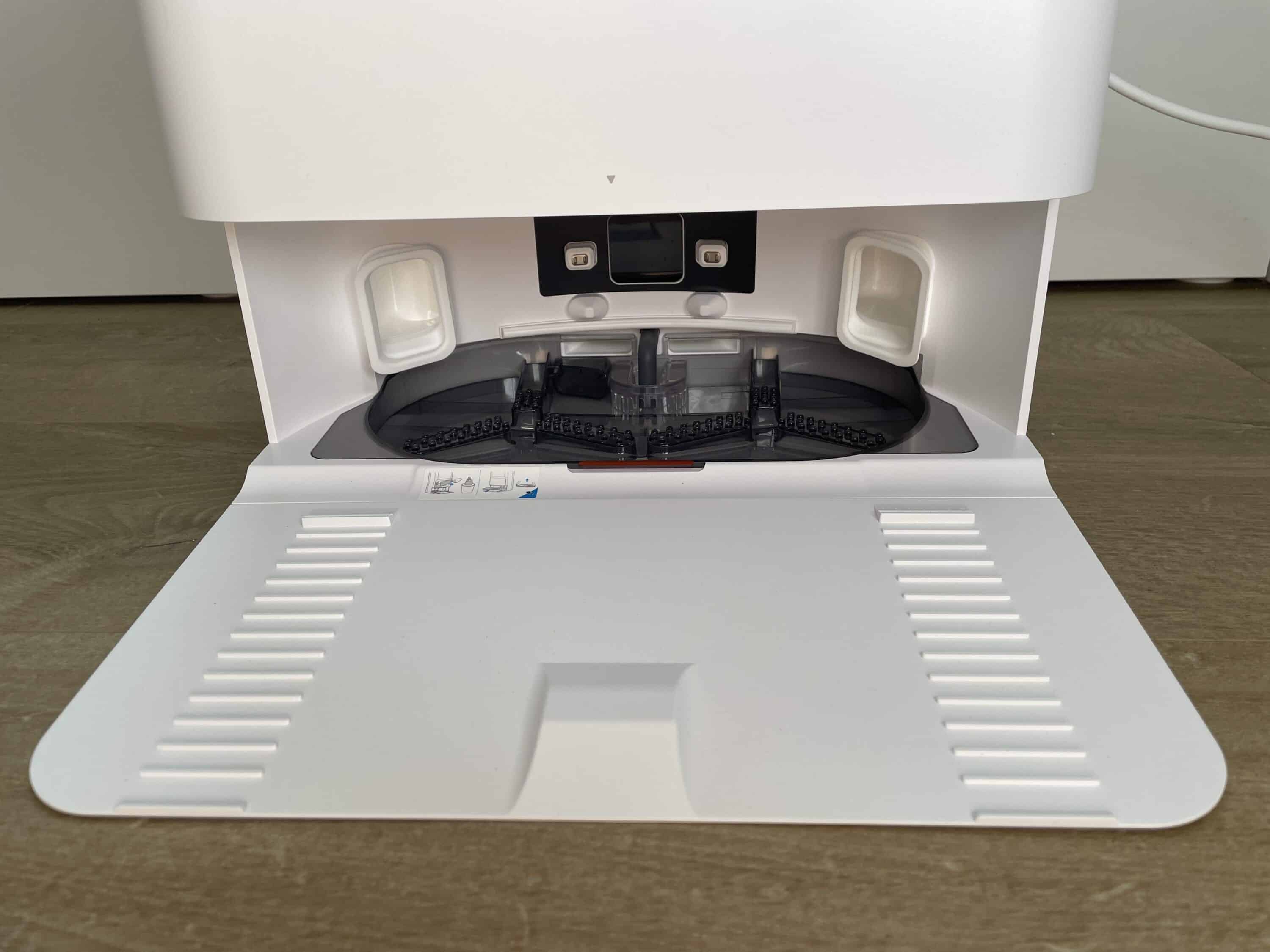 Stattdessen sind sie offen zugänglich. Über die Abdeckplatte an der Front erhält man wiederum Zugang zum Innenleben der Station. Hier lässt sich der Staubbeutel für die Absaugfunktion einsetzen. Diese soll angesichts eines recht großen Volumens nur etwa alle 60 Tage durch einen neuen ausgewechselt werden müssen. Ein Narwal Freo Z Ultra (Test) hält hier jedoch deutlich länger durch.