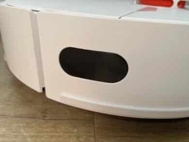 Im Inneren des Türmchens rotiert dabei eine rote Lasereinheit, die bei der Navigation zum Einsatz kommt. Vor dem Türmchen sitzt eine rudimentäre Bedieneinheit mit zwei physischen Tasten. Über die Wartungsklappe auf der Oberseite erhält man Zugang zum Innenleben des smarten Haushaltshelfers.