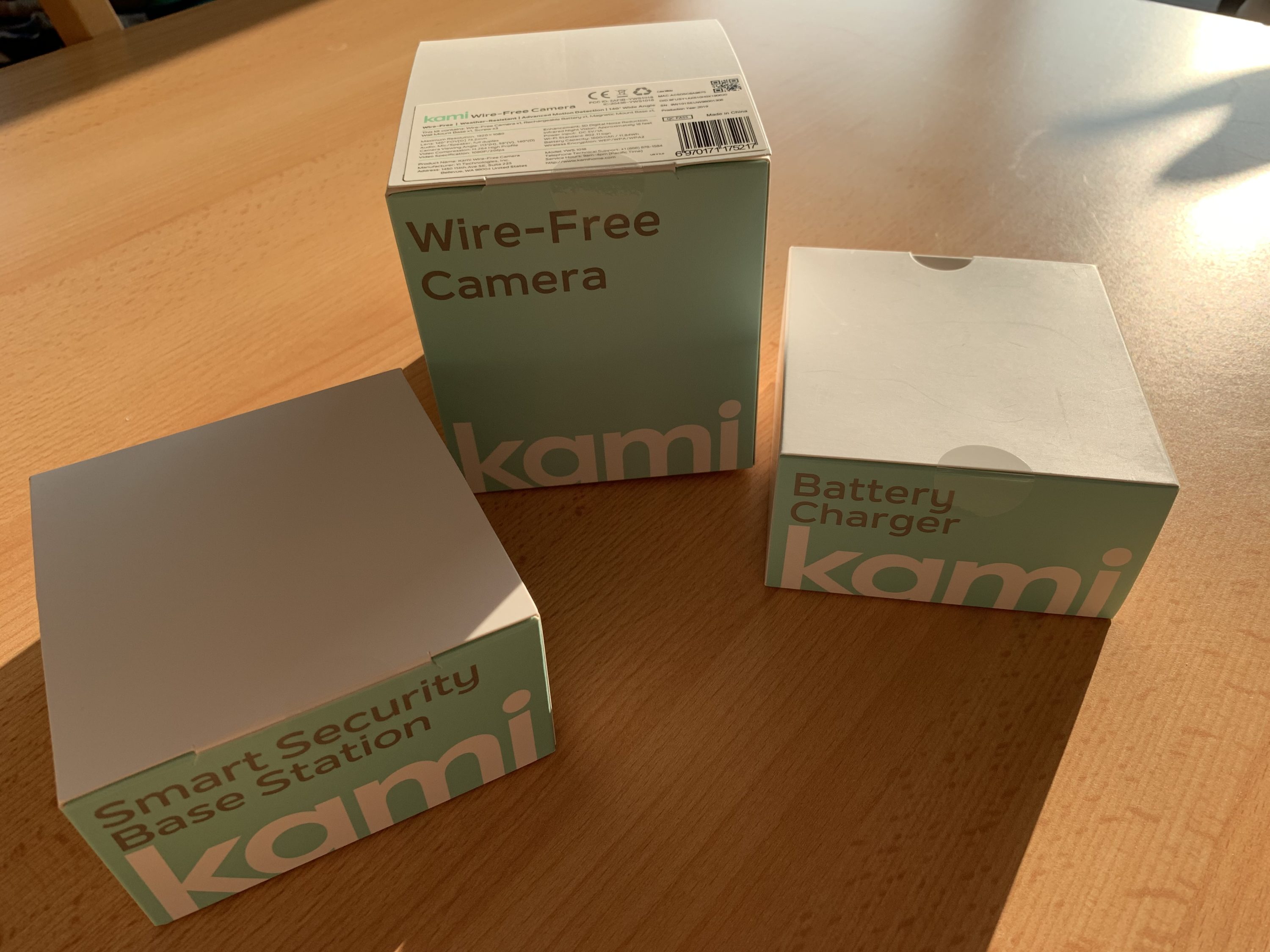 Das Kami Wire-Free Camera Kit kommt in einem weiß-mintfarbenen Karton daher. In diesem befinden sich drei weitere kleinere Kartons. Genauso wie die Umverpackung, sind diese in gleicher Optik gehalten und enthalten die Bezeichnungen der einzelnen Hardwarekomponenten. Das Kit besteht aus der Kamera und einem Akku, einem Ersatz-Akku samt Ladegerät sowie der für den Betrieb notwendigen Basis-Station mit allen Kabeln.