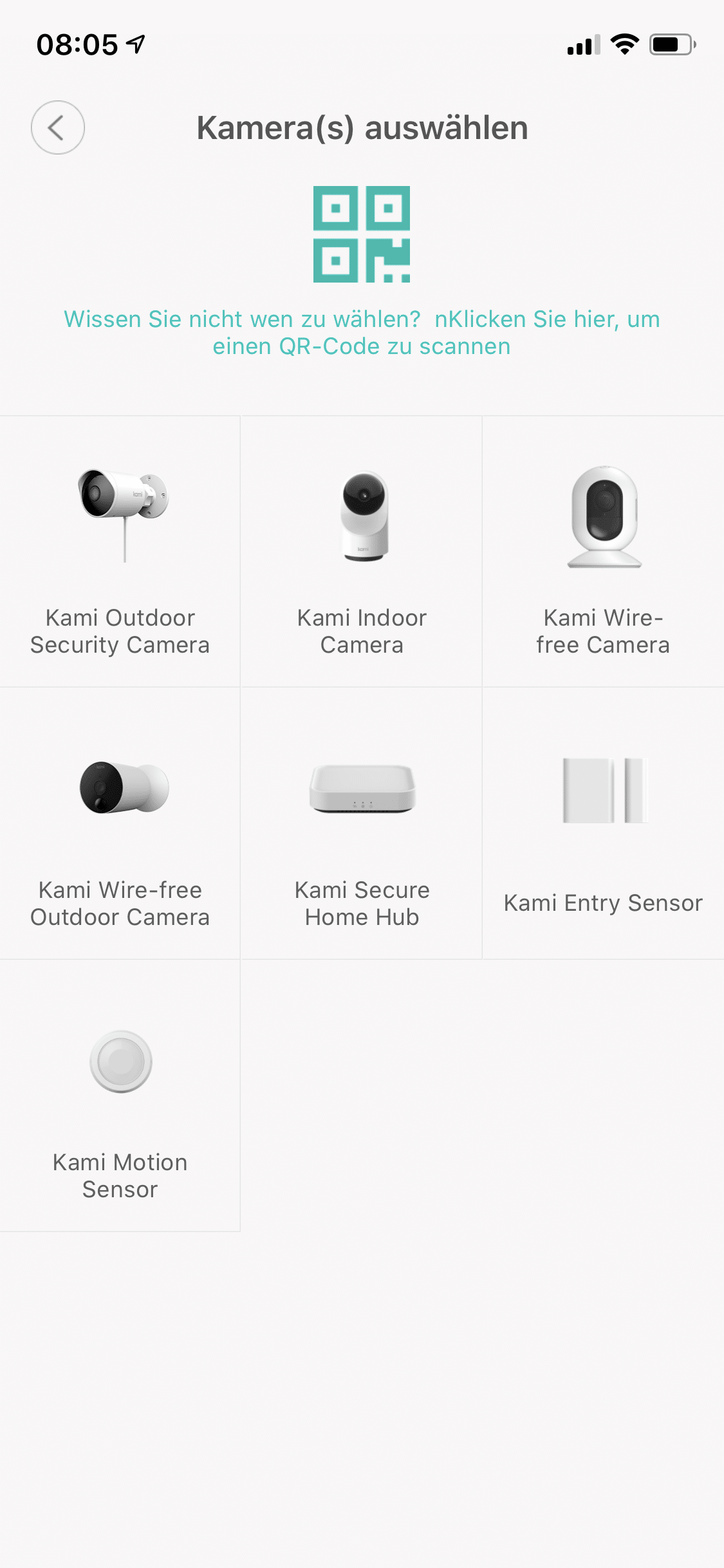 Sobald das Pairing erfolgreich ist, gelangt der Endanwender wieder auf den Start-Screen der App. Danach ähnlich wie zuvor den Reiter „Cameras“ antippen und auf das Plus-Symbol zum Hinzufügen einer Kamera klicken. Das gewünschte Modell aus der vorhandenen Produktauswahl auswählen.