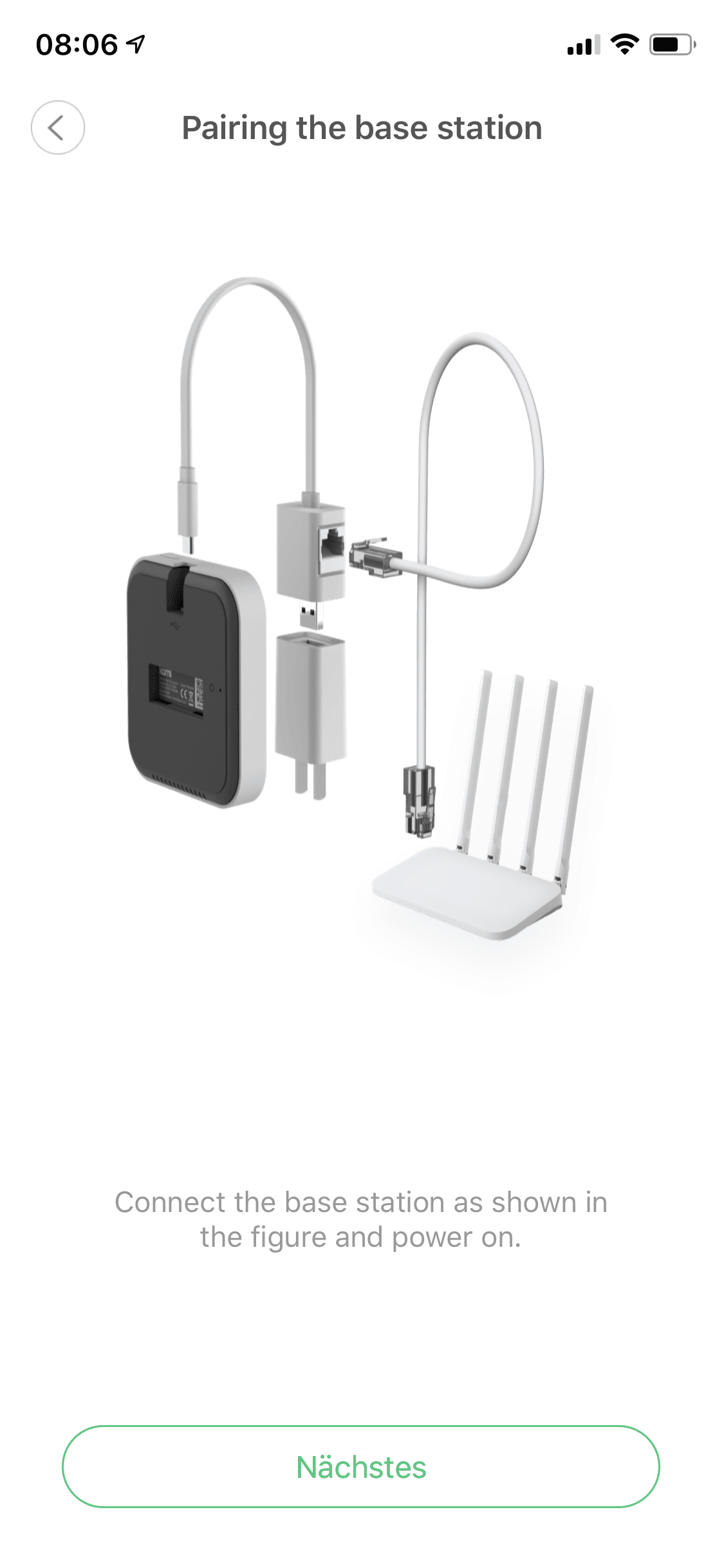 Nun erst kommt die Hardware ins Spiel, indem die Basis-Station sich mit der App koppelt. Dazu innerhalb der App auf den Reiter „Base Stations“ tippen. An dieser Stelle erscheint ein unübersehbares „Wie fange ich an?“-Video. Dieses ist nett gemeint, jedoch zum einen nur auf englisch und zum anderen funktioniert das abgebildete Kameramodell anders in der Einrichtung als die hier getestete Kami Wire-Free Camera.