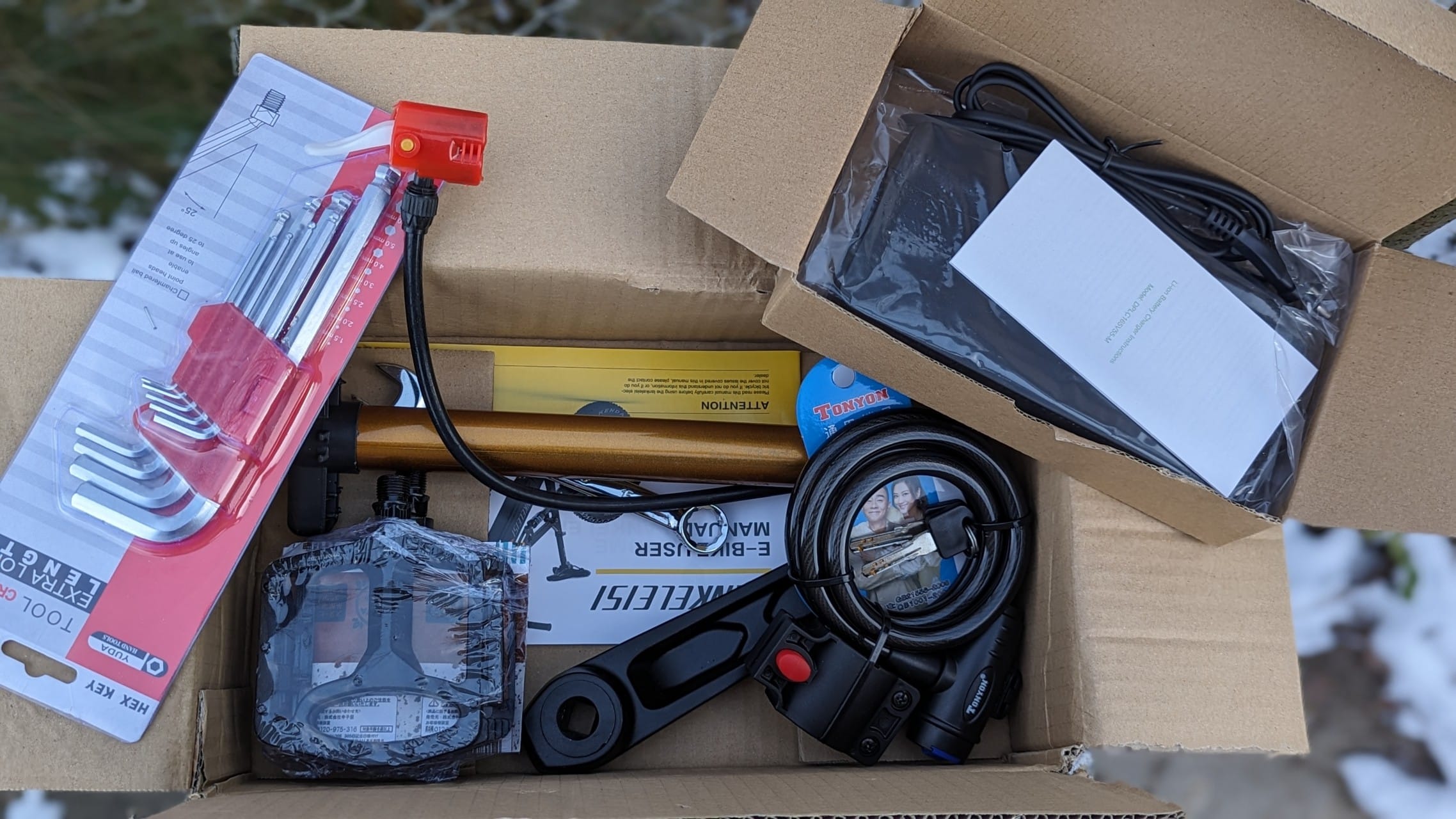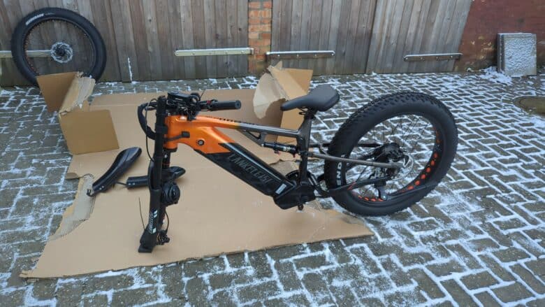 Das E-Bike von Lankeleisi wird demontiert in einem großen, relativ schmalen Karton geliefert. Für Online-Käufer eines Fahrrads bedeutet dies, sich auf umfangreiche Montagearbeiten einzustellen. Dieser Herausforderung stellten wir uns ebenso. Erfreulicherweise waren neben den Fahrradkomponenten auch eine Anleitung und einige Montagewerkzeuge im Karton vorhanden, wobei die Qualität der Werkzeuge positiv hervorstach, da sie über dem üblichen Standard für mitgelieferte Montagewerkzeuge lag. Ebenfalls im Lieferumfang enthalten, allerdings von minderer Qualität, waren eine Luftpumpe und ein Fahrradschloss mit zwei Schlüsseln. Trotz der weniger überzeugenden Qualität dieser beiden Artikel, hinterlässt der Gesamtlieferumfang einen soliden Eindruck von Lankeleisis Bemühungen um Kundenzufriedenheit.