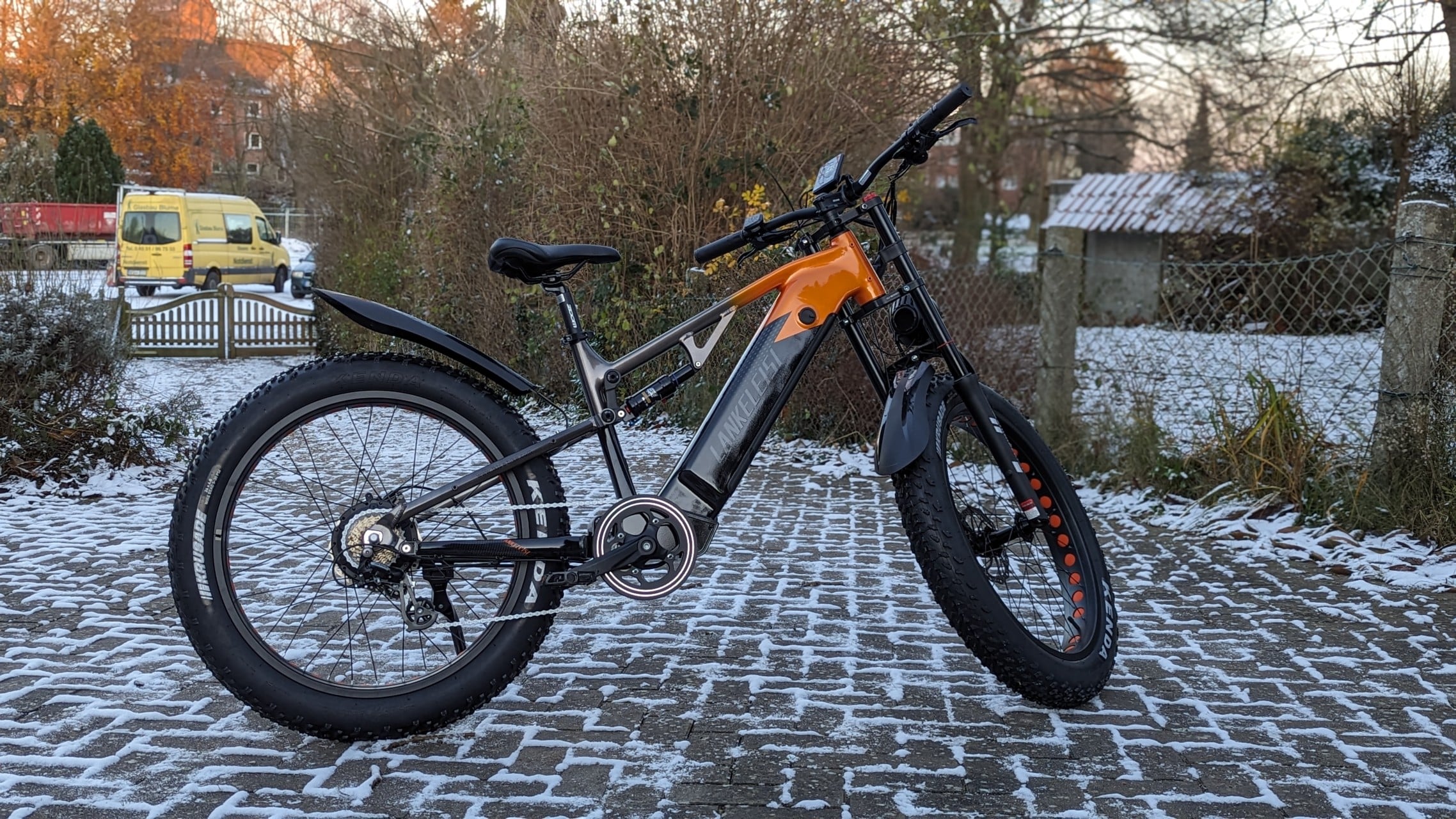 Steht das E-Bike erst einmal, wird offensichtlich, wie auffällig es gestaltet ist. Los geht es bereits bei den besonders breiten Reifen, die 26 x 4.0 Zoll messen – und damit eher zu einem Leichtkraftrad als zu einem Fahrrad passen würden. Ebenfalls auffällig sind der orangene Teil des Rahmens sowie die orangenen Farbakzente auf der Innenseite der Reifen. Hinzu kommt ein relativ breiter Lenker. Lankeleisi möchte, dass das RV800 Plus gesehen wird. Ist das bereits ein Hinweis darauf, dass der Hersteller mächtig stolz auf sein Machwerk ist? Oder doch bloße Verspieltheit?