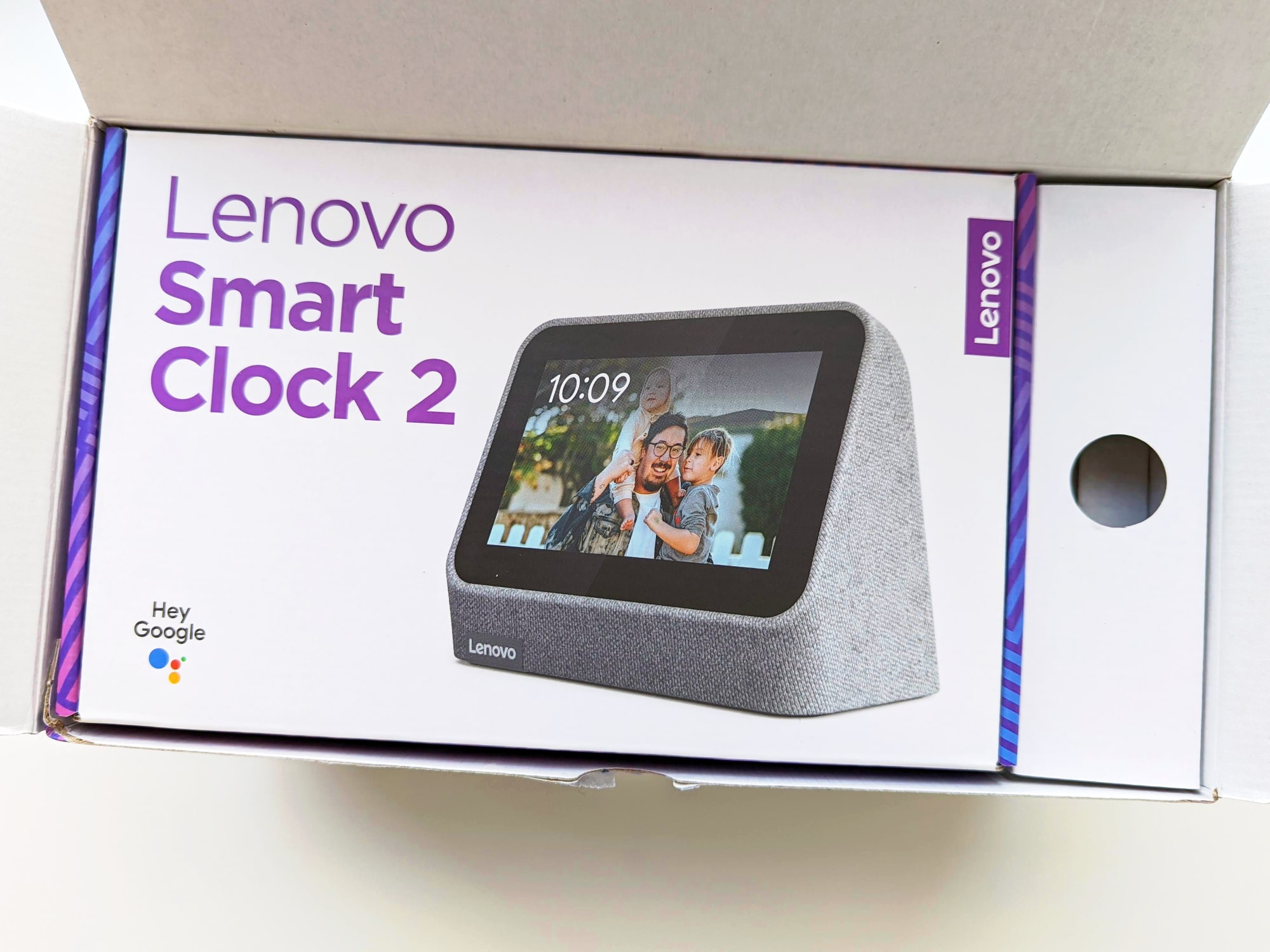 Die Lenovo Smart Clock 2 kommt in einem kompakten Karton, auf dessen Vorderseite der smarte Wecker abgebildet ist. Das Hey Google-Logo zeigt zudem direkt, welchen Sprachassistenten man verwendet. Besitzt ihr das Bundle mit Qi-Ladedock, sind im Inneren zwei weitere Kartons. Dabei handelt es sich um die Verpackung der Smart Clock 2 und das Dock, das sich darunter befindet.