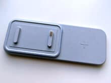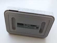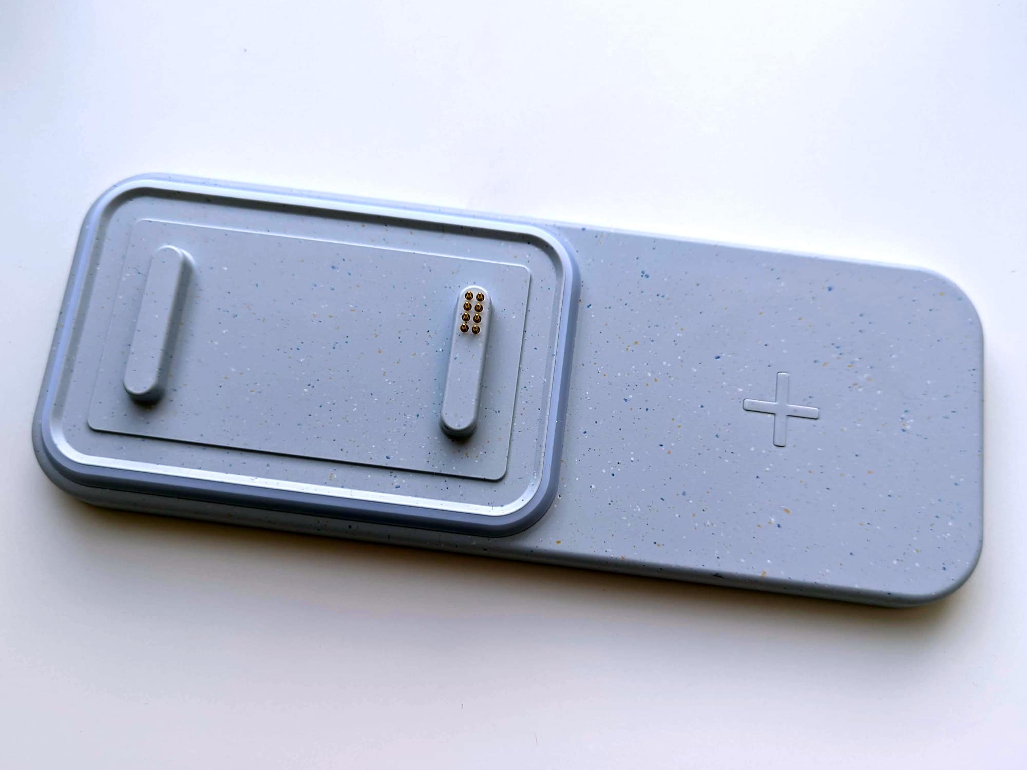 Das Qi-Ladedock ist, wie bereits angesprochen, ebenfalls grau. Es ist länglich, flach und bietet einen festen Platz für die Smart Clock 2. Diese wird einfach daraufgesteckt. Die Stromübertragung funktioniert über die Pins, eine separate Stromversorgung ist nicht notwendig. Das Ladedock besitzt zwar einen USB-Anschluss, hierbei handelt es sich allerdings um einen USB-A-Anschluss, welcher euch die Möglichkeit bietet andere Geräte, bspw. eure Smartwatch, per Kabel zu laden. Weiterhin befindet sich dort ein leicht durchsichtiger Ring, welcher als Nachtlicht dient. Hinter diesem befinden sich mehrere LEDs.