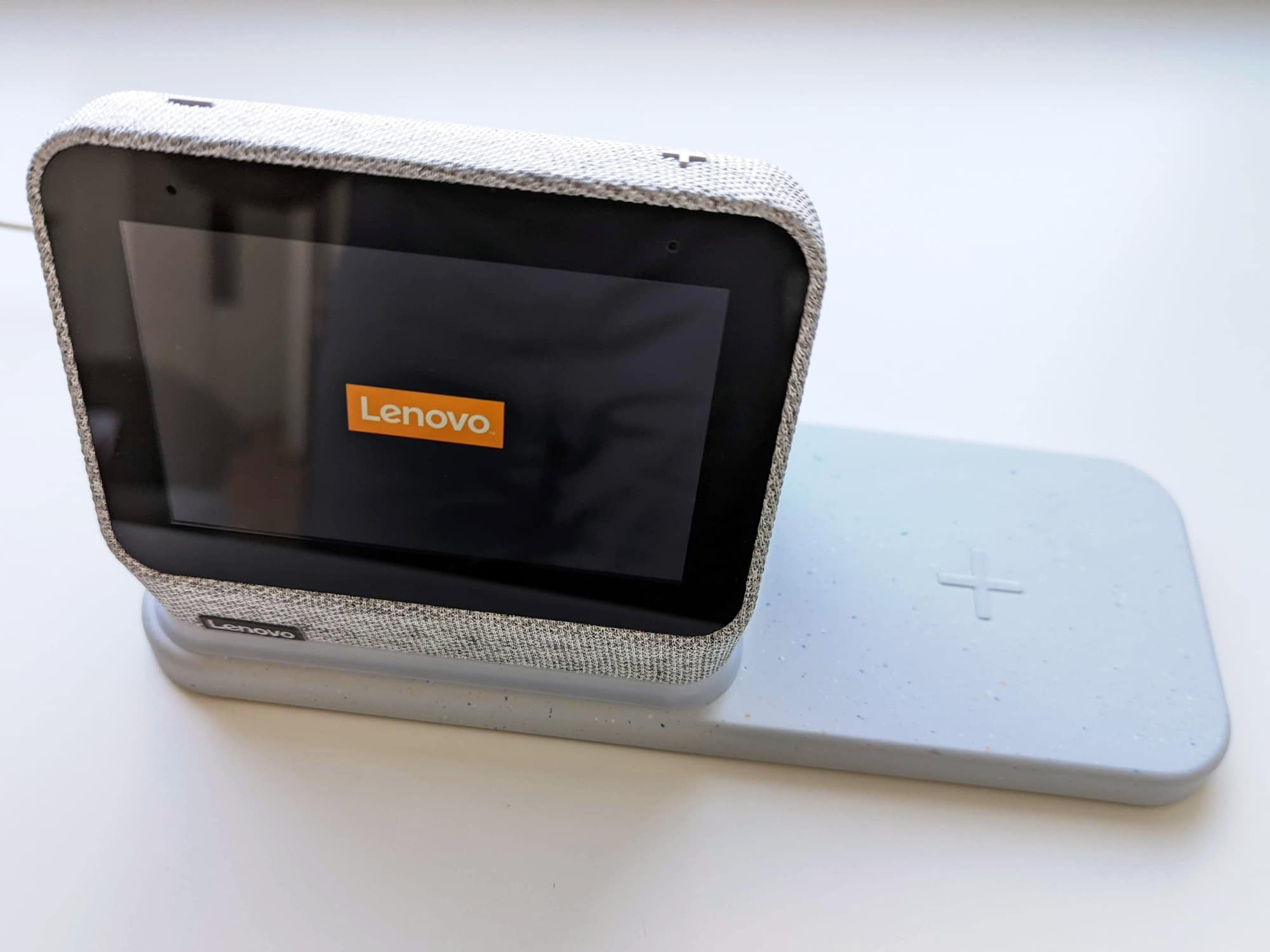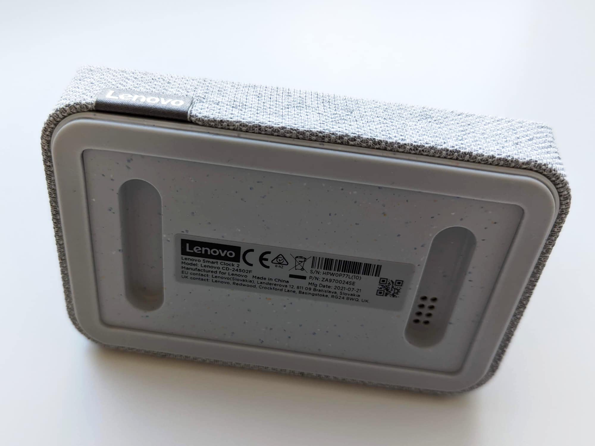 Für den Test steht uns das Bundle in der Farbe Heather Grey zur Verfügung. Die Smart Clock 2 ist weiterhin in den Farben Blau und Schwarz erhältlich, das Qi-Ladedock gibt es nur in grau. Die Smart Clock erinnert von der Größe her an einen ganz normalen Wecker. Auf der Vorderseite befinden sich das knapp 4 Zoll große Display und am unteren Rand ein kleines Lenovo-Logo auf dunkelgrauem Grund. Der Rest des Geräts ist mit einem hellgrauen Stoff überzogen. Die Anzahl der Bedienelemente ist übersichtlich gehalten, neben dem Touch-Display gibt es nur zwei Lautstärketasten auf der Oberseite und einen Mikrofonschalter auf der Rückseite. Weiterhin befindet sich dort auch der Stromanschluss.