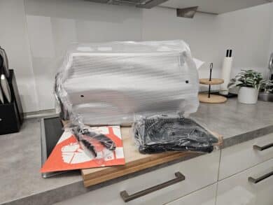 Als wir die Heißluftfritteuse aus dem Karton nahmen, waren wir im ersten Moment von der Größe und auch dem Gewicht (ca. 9 Kilo) des Geräts überrascht. Für Küchen, in denen wenig Platz vorhanden ist, ist die Cosori zu groß. Da wir aber glücklicherweise viel Platz in unserer Küche haben, passt sie sehr gut auf die Arbeitsplatte.