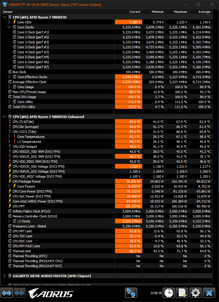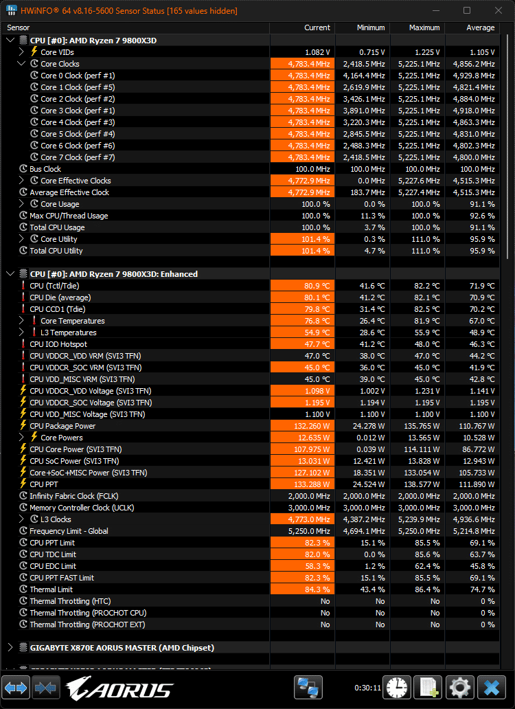 Die Kühlleistung der Mystique 360 ARGB ist sehr solide. Im Bios wurde nur der X3D Turbo Mode und Expo für Ram aktiviert, ansonsten keine Übertaktung. Im prime95 Small FTT-Test lag die Temperatur der CPU auch nach 30 Minuten bei maximal 82°C, wobei die CPU mit einem Takt um die 4800 MHz arbeitete und dabei aber insgesamt 135 W Leistung verbrauchte.