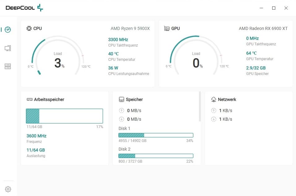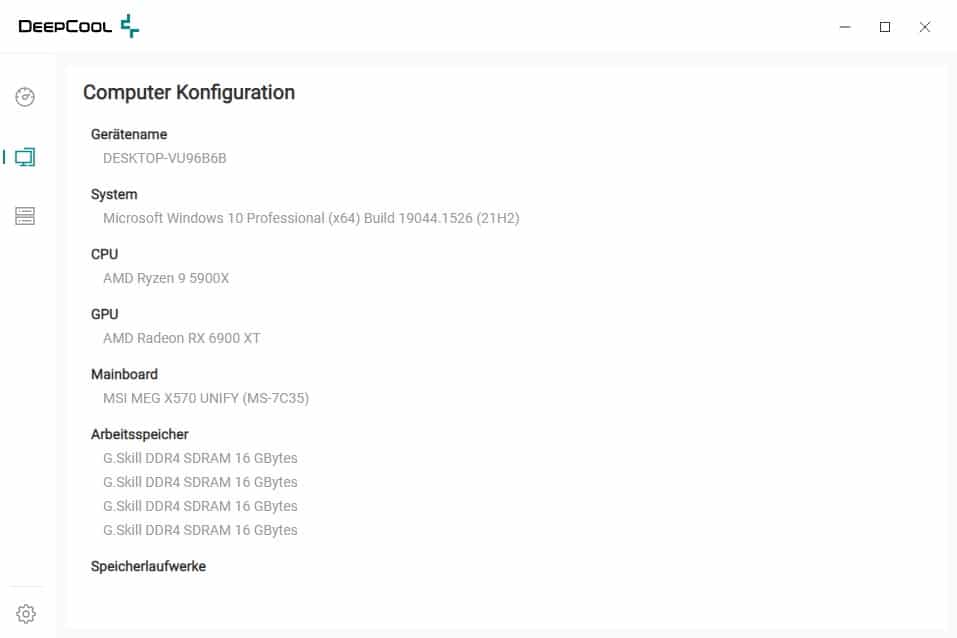 Nachdem die Lüfterkurve angepasst worden ist und der PC in das Betriebssystem gebootet wurde, konnte die Software für dieses Produkt installiert werden. Die Setup-Datei lässt sich auf der Homepage von Deepcool, downloaden sowie unkompliziert installieren. Die Software ist sehr übersichtlich aufgebaut und dabei in 3 Ebenen aufgeteilt.
