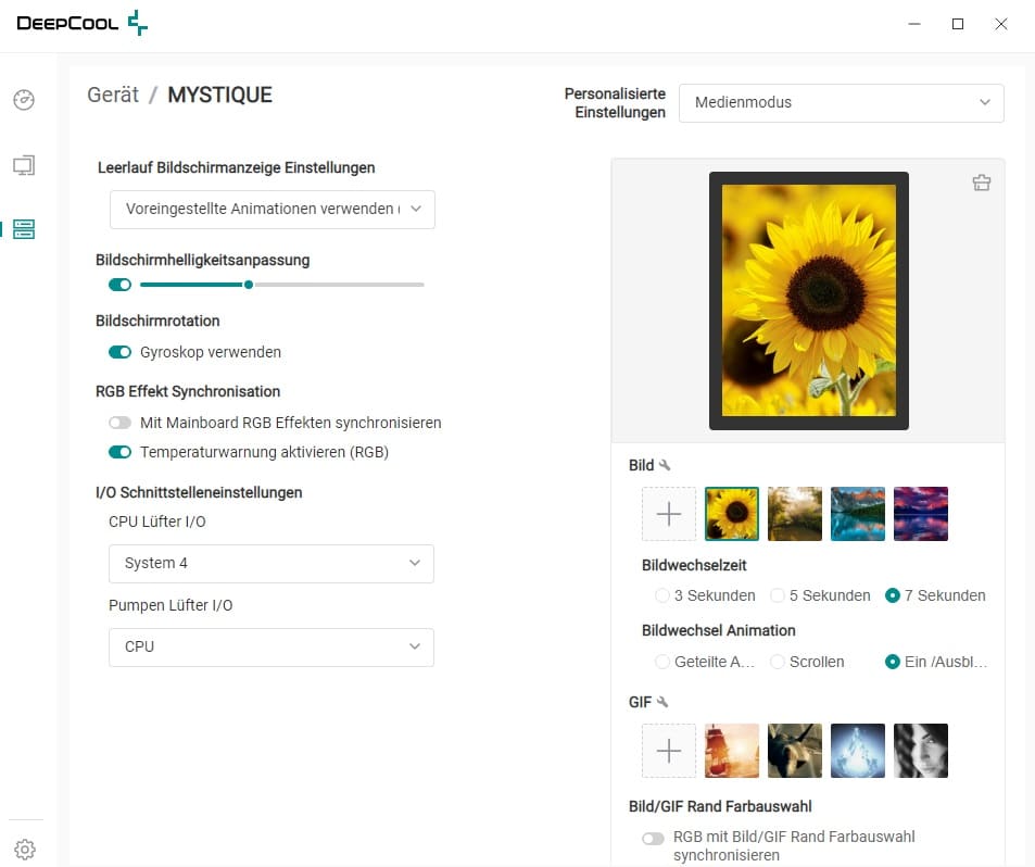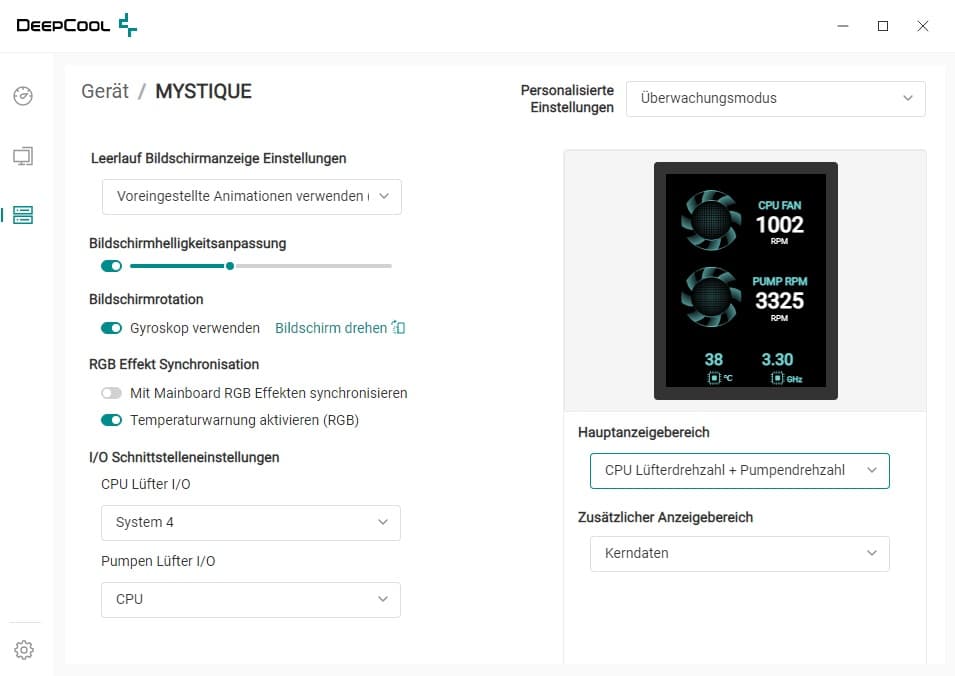 - Auf der letzten Ebene, die einfach nur Gerät heißt, kommen wir zum eigentlichen Kern der Software. Hier muss erstmal die verbaute Pumpe Mystique ausgewählt werden. Durch Anklicken dieser, öffnen sich all die Optionsmöglichkeiten die diese Software für die Einstellungen am Monitor bietet.Hier kann z.B. die Helligkeit des Displays geregelt werden. Wenn man mit dem Gyroskop nicht ganz einverstanden ist, kann hier die Ausrichtung der Anzeige gedreht werden. Die RGB Effekte lassen sich mit dem Mainboard synchronisieren, denn diese Software bietet keine eigene Einstellmöglichkeit der RGB Beleuchtung. Unter dem Dropdown Menü Personalisierte Einstellungen, kann die Anzeige ganz individuell angepasst werden.