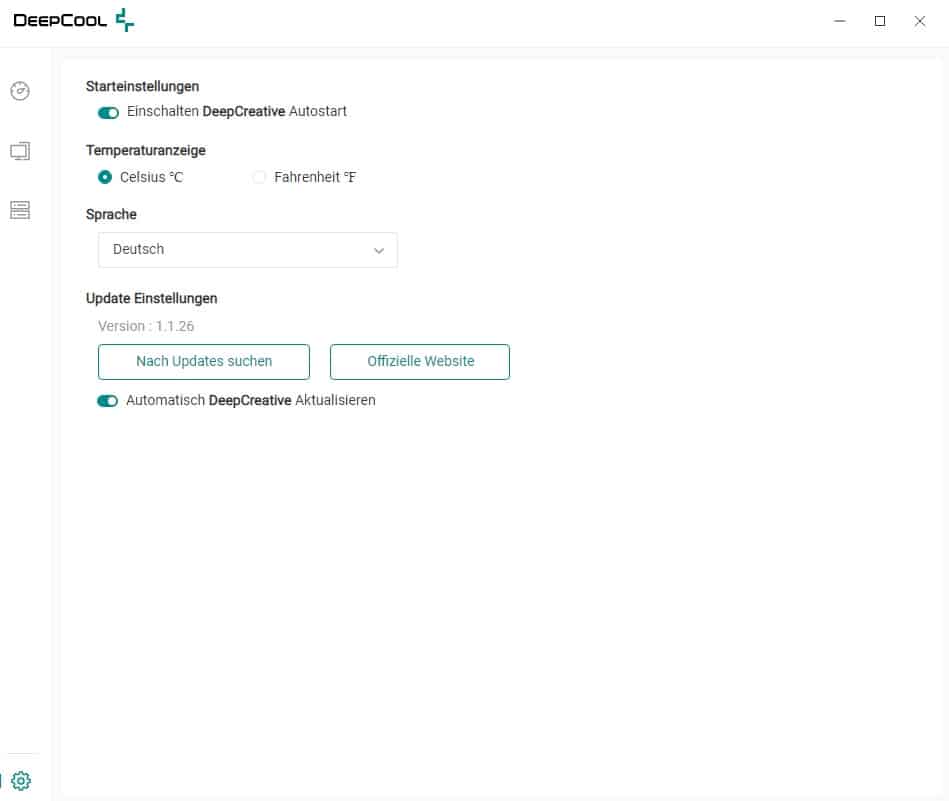 - Einstellungen: Wird die DeepCool Software nicht in den Autostart des Systems eingebunden, wird auf dem Display lediglich ein grüner Schriftzug von Deepcool angezeigt. Wenn die Software