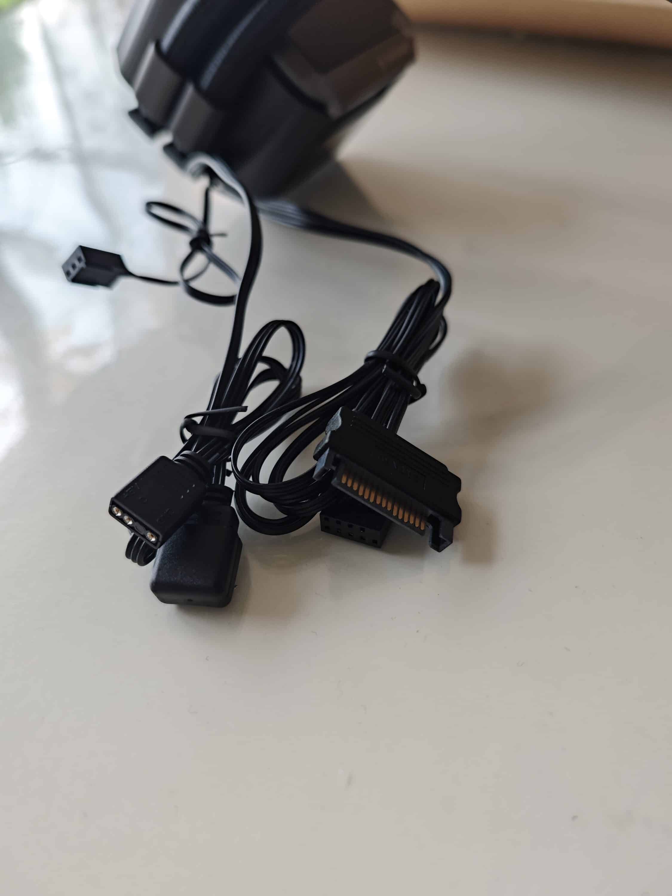 Die beiden Kabel von der Pumpe ausgehend, konnten an den Schläuchen entlang weggeführt werden, bevor sie schließlich hinter dem Mainboard verschwinden. Die beiden Klettstreifen an den Schläuchen dienen in diesem Fall praktischerweise als Kabelführung. Insgesamt ist das RGB-Kabel in meinem Fall ebenfalls etwas zu kurz bemessen, da der erforderliche 3-PIN Anschluss ganz unten auf dem Mainboard platziert ist.
