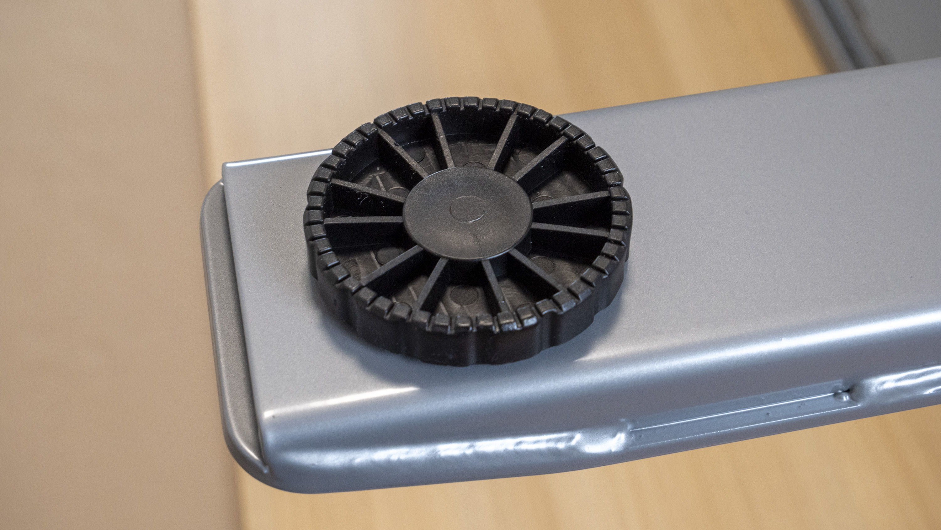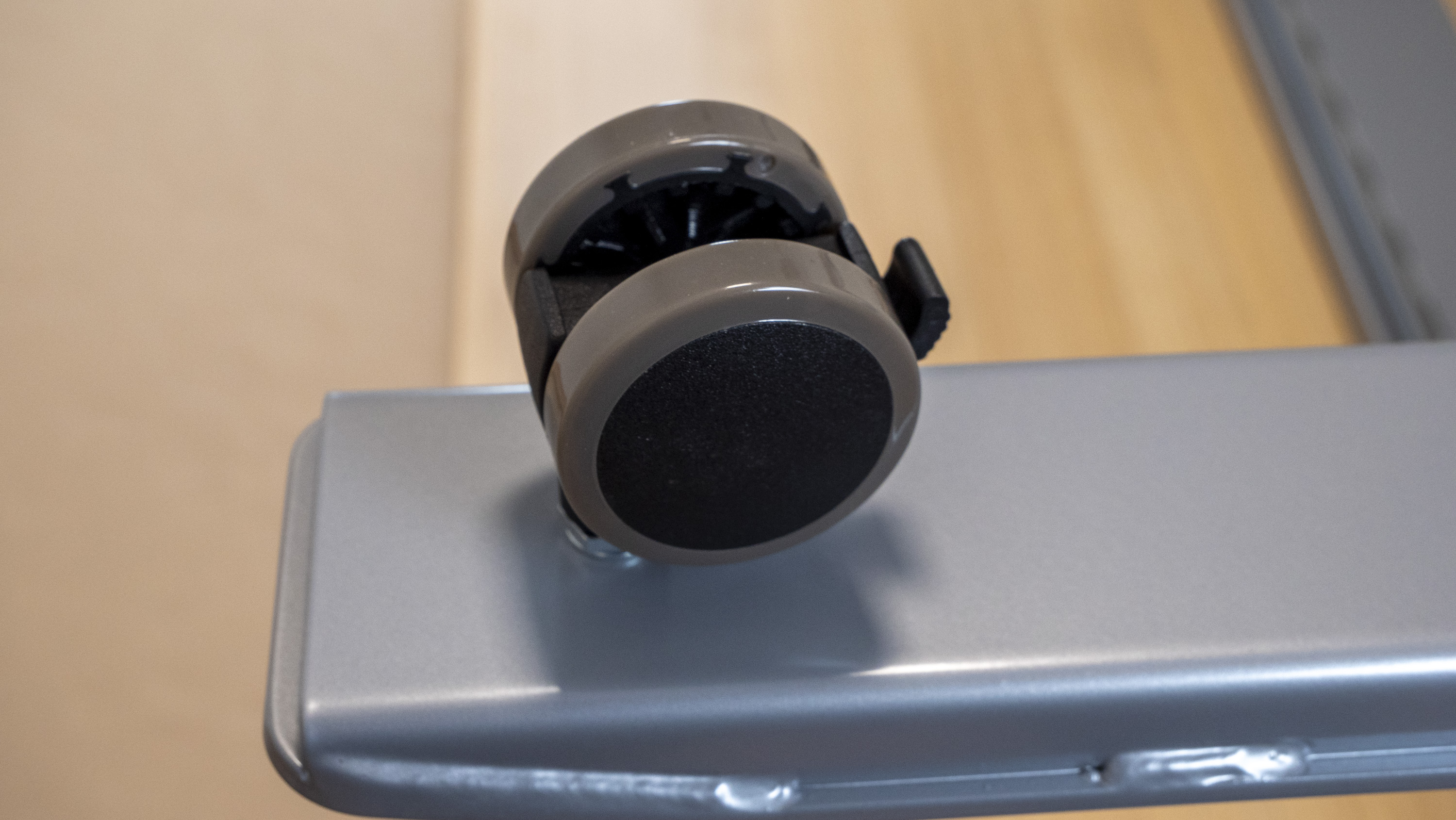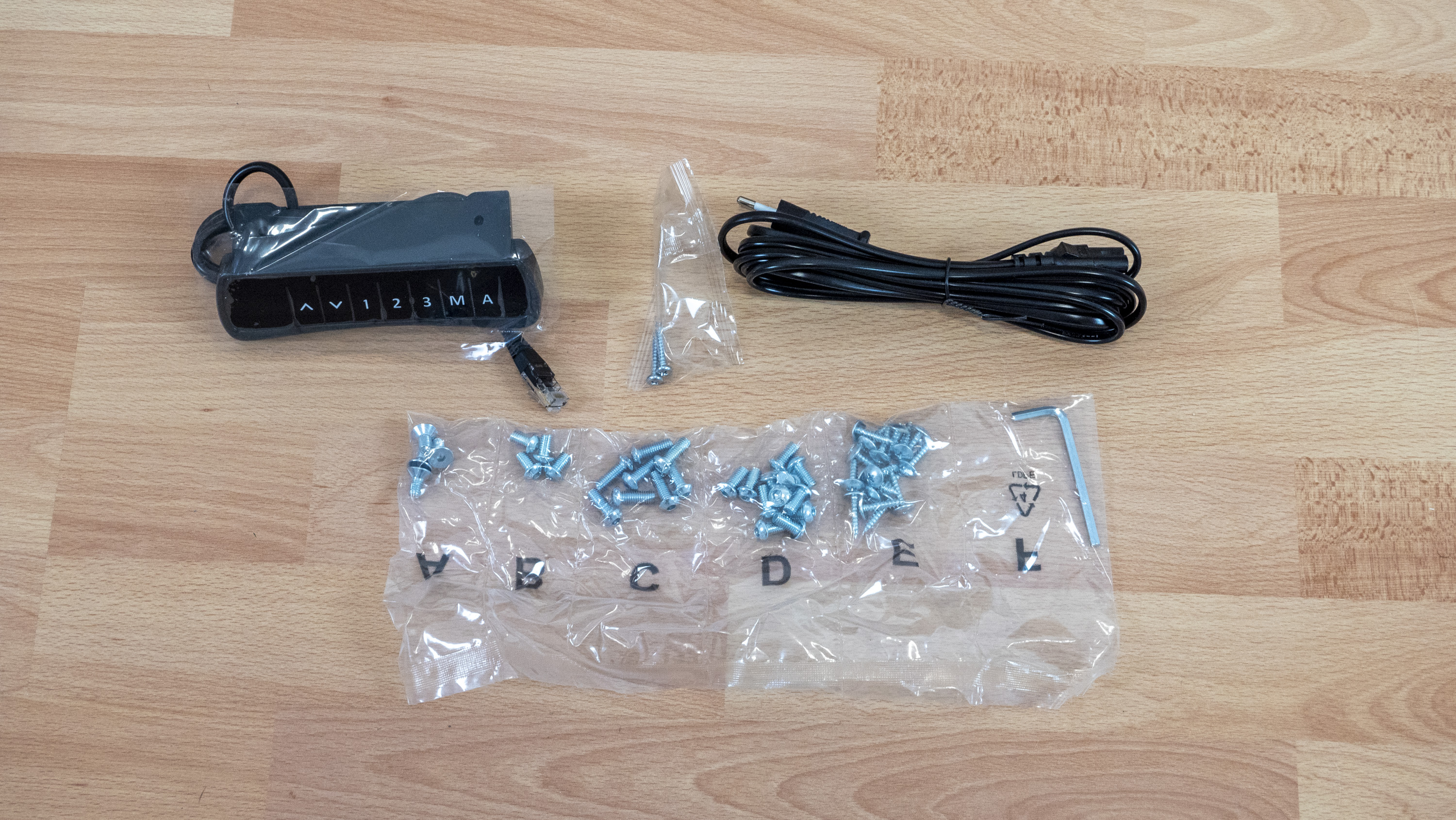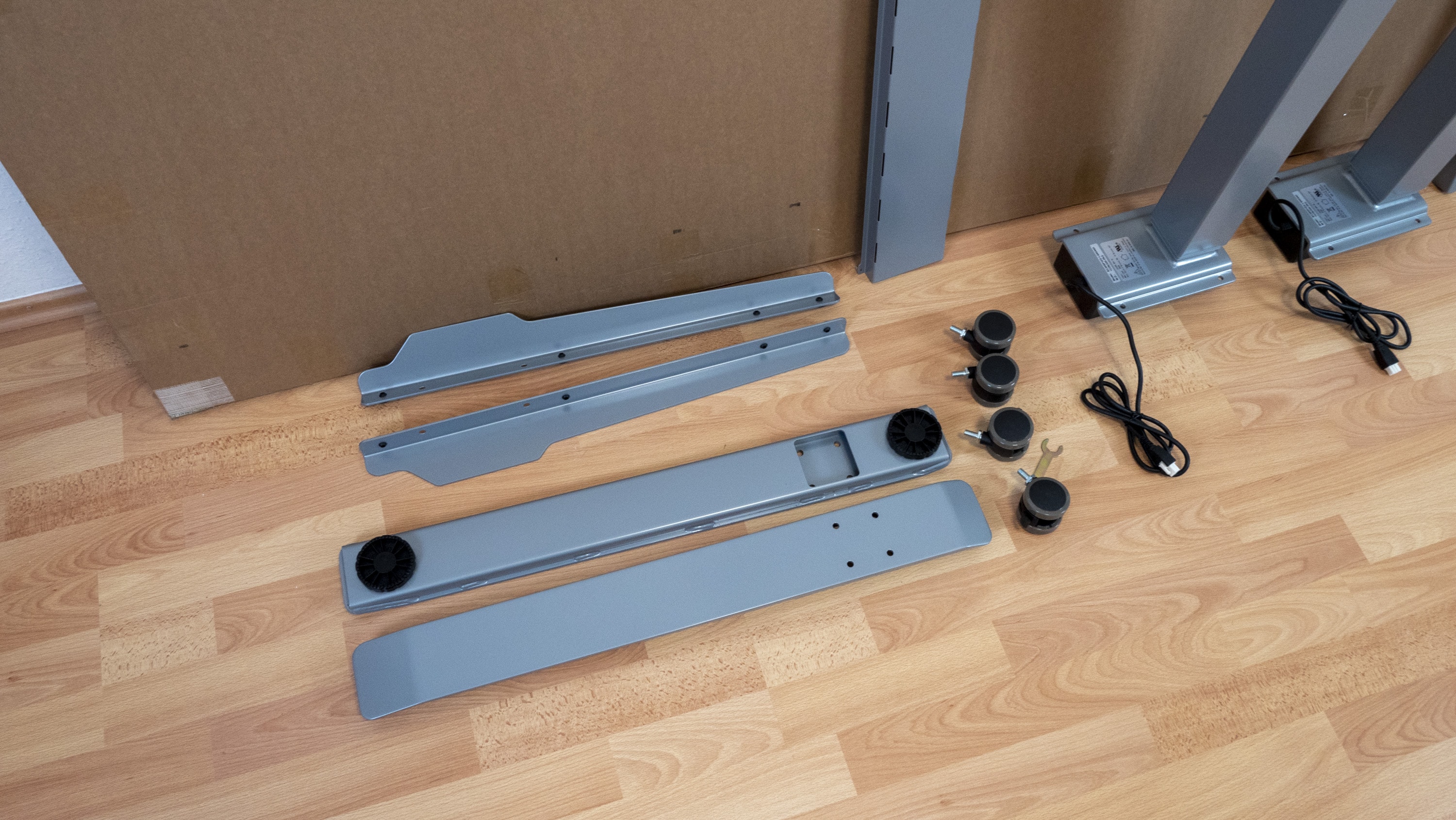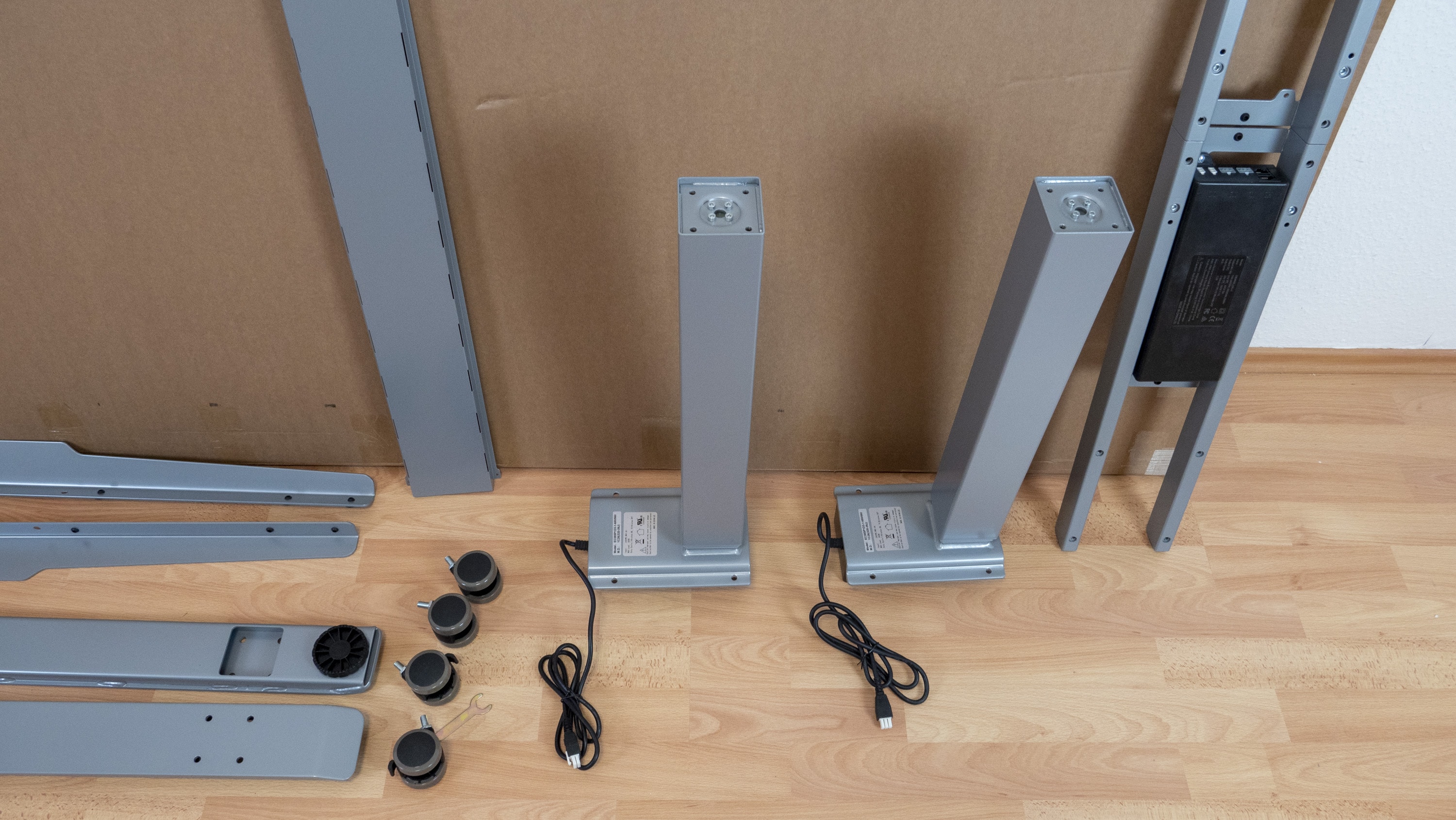 Die Tischplatte unseres Testobjekts hat die Maße 180 cm x 80 cm und ist 25 mm dick. Dabei entschieden wir uns für die Tischplatte „Sorano Eiche Hell“. Die 3-Segment-Tischbeine-Premium C kommen in klassischem Grau daher, können aber auch in Weiß oder Schwarz geliefert werden. Die praktischen, optional erhältlichen Tischrollen sind wiederum schwarz. Im Lieferumfang gibt es keine großen Überraschungen. Liftor legt alles das bei, was man für die Montage des höhenverstellbaren Schreibtischs benötigt. Dabei fiel positiv auf, dass alle Einzelteile des Tischs hochwertig verarbeitet waren.