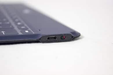 Außerdem fällt direkt auf, dass Logitech für ausreichend Schutz beim Arbeiten sorgt. Die Tastatur ist gegen Spritzwasser geschützt, dafür ist die Tastatur versiegelt. Komplett wasserfest ist sie nicht, irgendwie muss der verbaute Akku geladen werden. Auf der rechten Seite finden wir den Ein-/Ausschalter sowie den microUSB-Port.