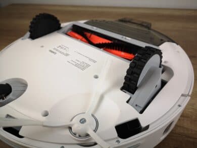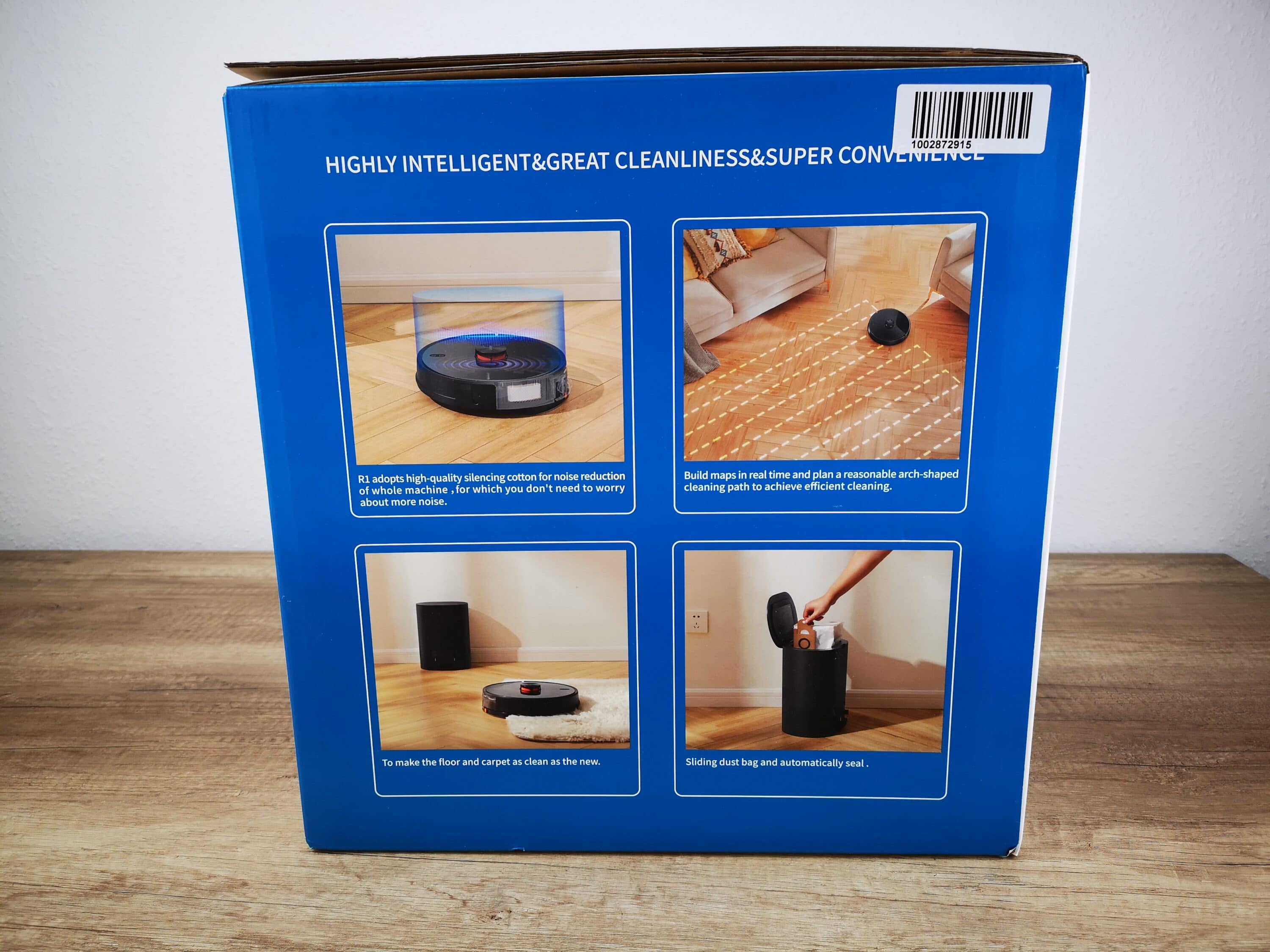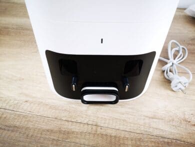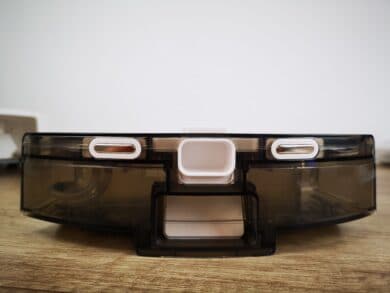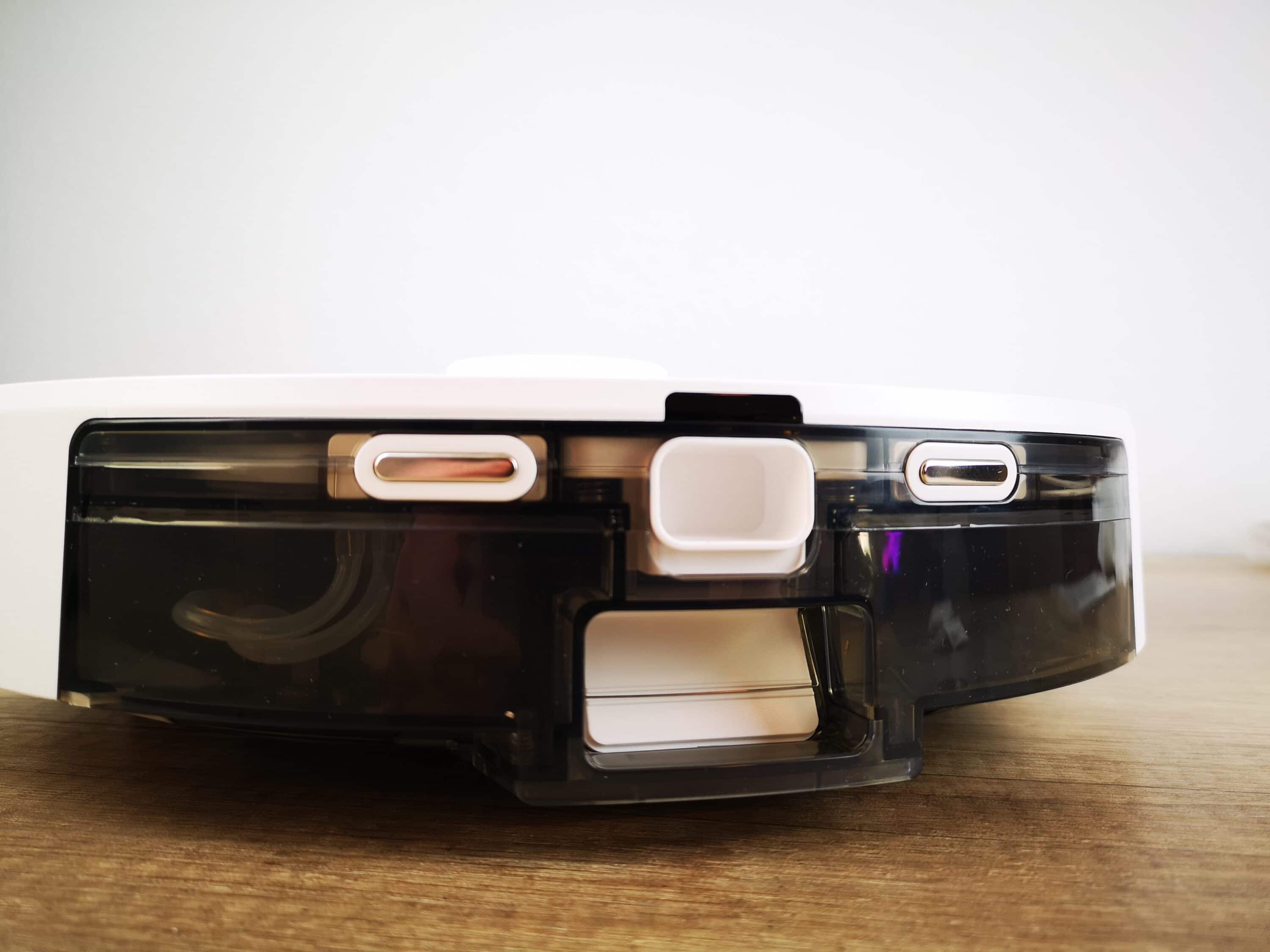 Auf der Rückseite des Roboters befindet sich der herausnehmbare Behälter, der eine Kombination aus Wassertank und Staubbehälter bildet. Dabei hat der Staubbehälter ein Fassungsvermögen von 200 ml, sollte dieser voll sein, fährt der R1 automatisch zurück zur Station und saugt den Schmutz heraus. Für das Wischen bietet der Wassertank Platz für 250 ml Wasser. Diese Menge reicht bei der kleinsten Wischstufe für maximal 150 m² Fläche, die mit einer Tankladung gewischt werden kann.