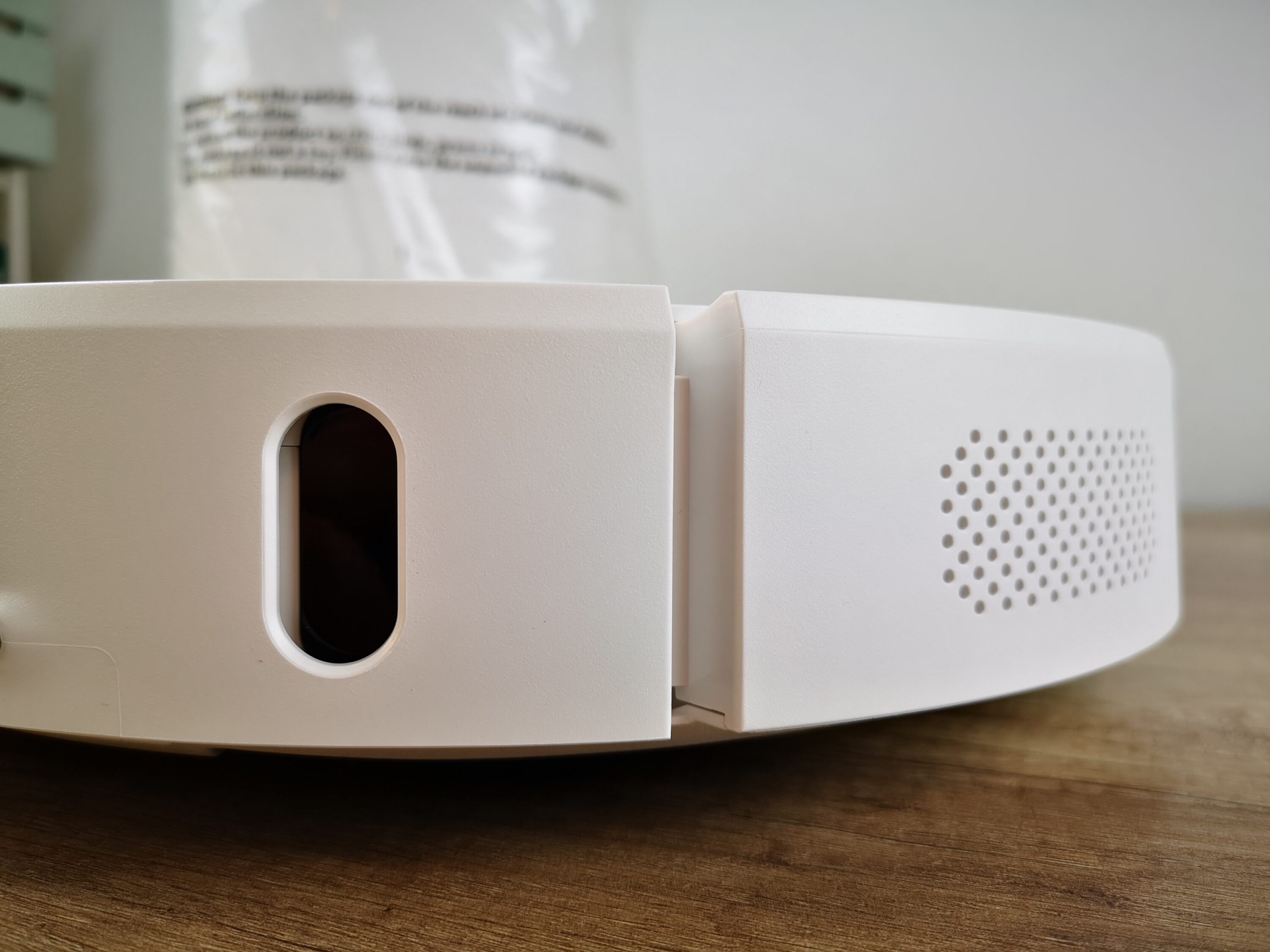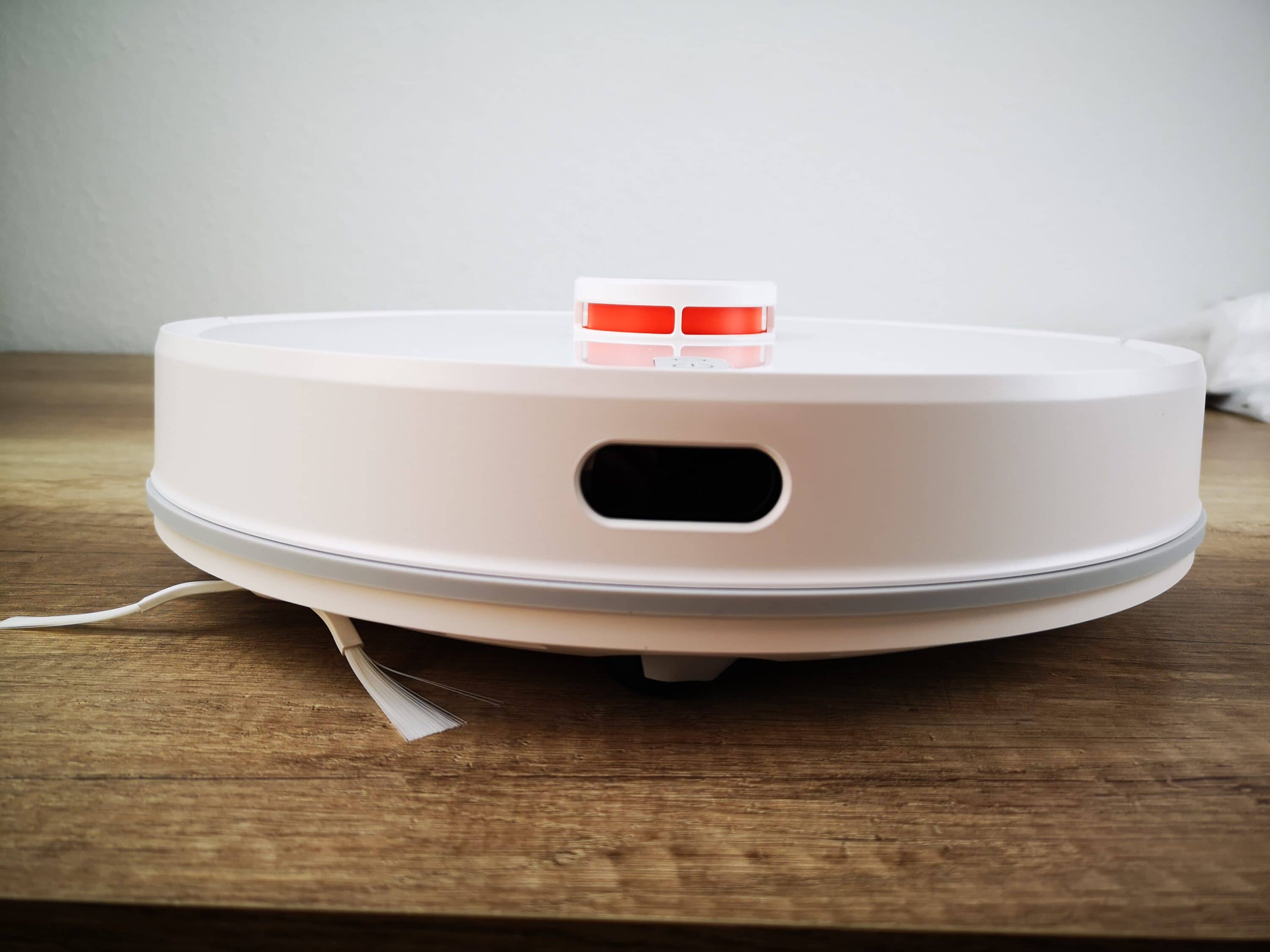 Der Lydsto R1 ist in den Farben Schwarz und Weiß erhältlich. Wie man bereits sehen konnte, handelt es sich bei unserem Testobjekt um die weiße Variante. Das Farbthema zieht sich durch das gesamte Design, dabei wechselt sich das strahlende Weiß mit einem hellen Grau ab. Grau sind dabei die Funktionstasten auf der Oberseite, sowie die Gummi-Umrandung an der Frontseite. Unter dem kleinen Turm auf der Oberseite befindet sich ein Teil der Sensoren, die für die Raumerkennung zuständig sind. Zusätzlich befinden sich hinter dem beweglichen Frontteil weitere Sensoren, die Hindernisse erkennen.