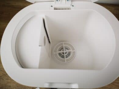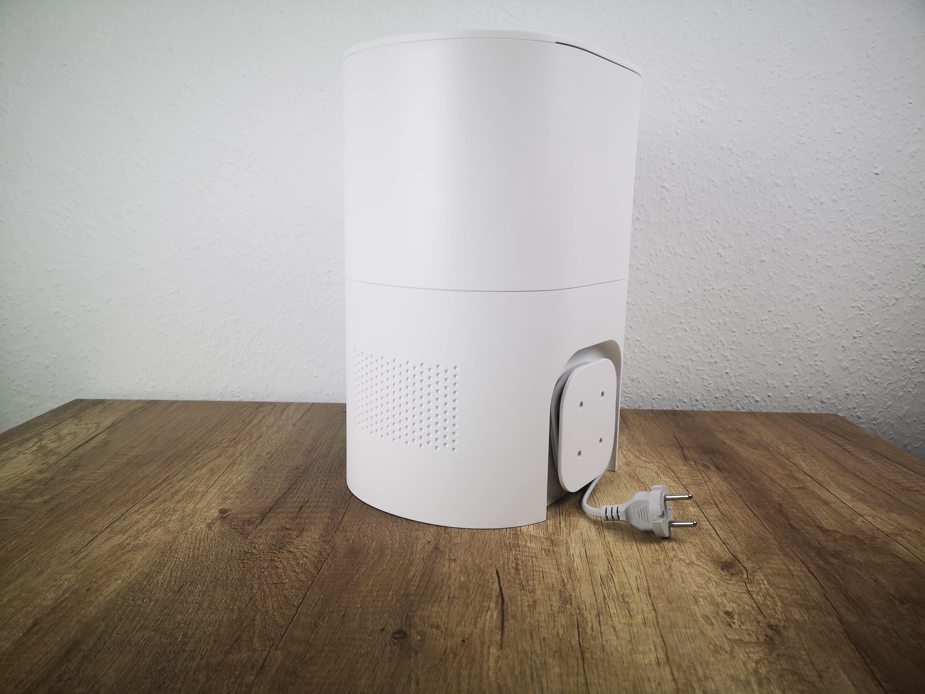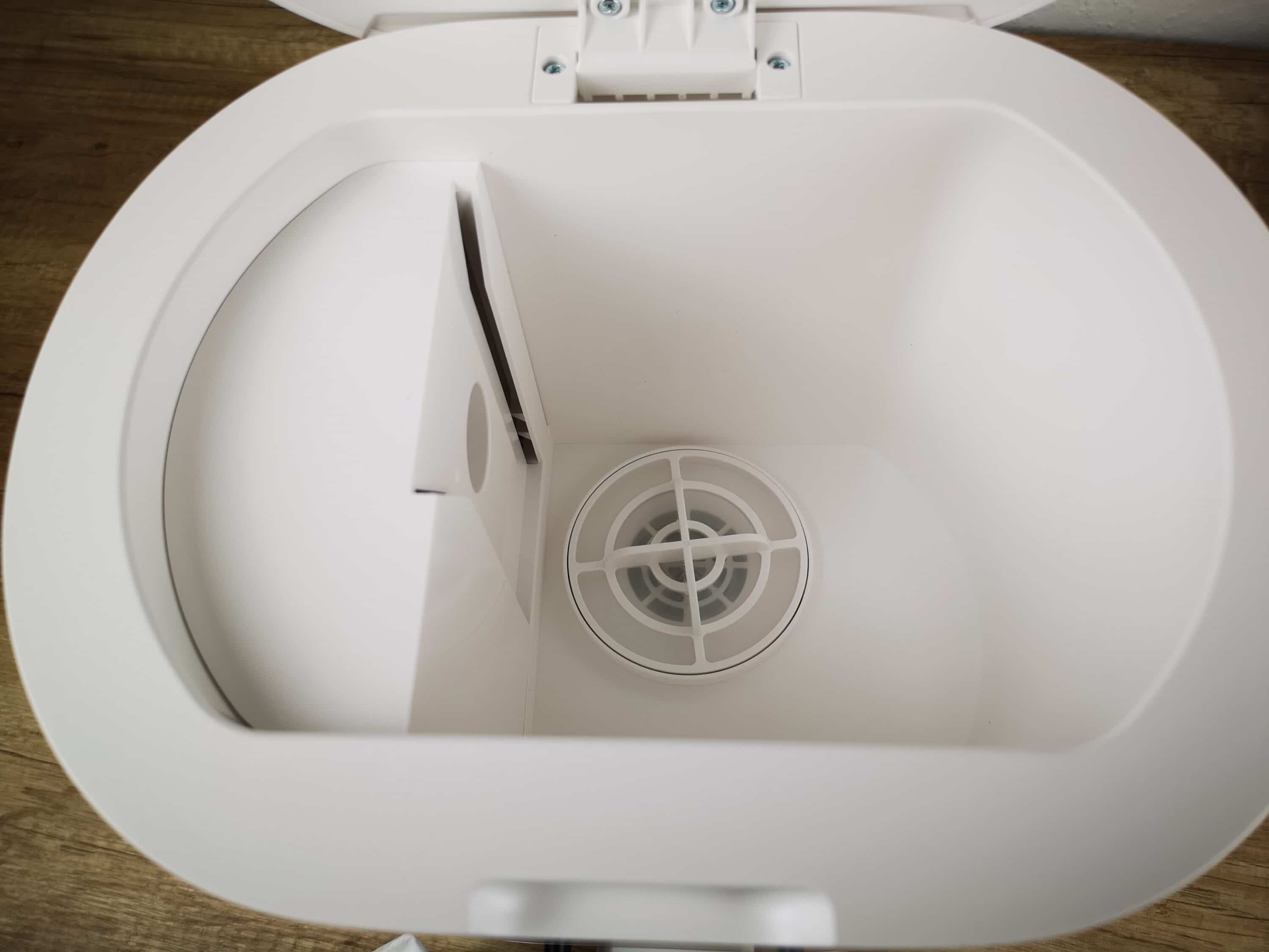 Auf der Oberseite des Behälters befindet sich neben der Öffnung, die zum Nachfüllen des Wassers dient, auch der Hepa-Filter der die Abluft filtert. Dieser ist herausnehmbar und kann nach Bedarf ausgetauscht werden.